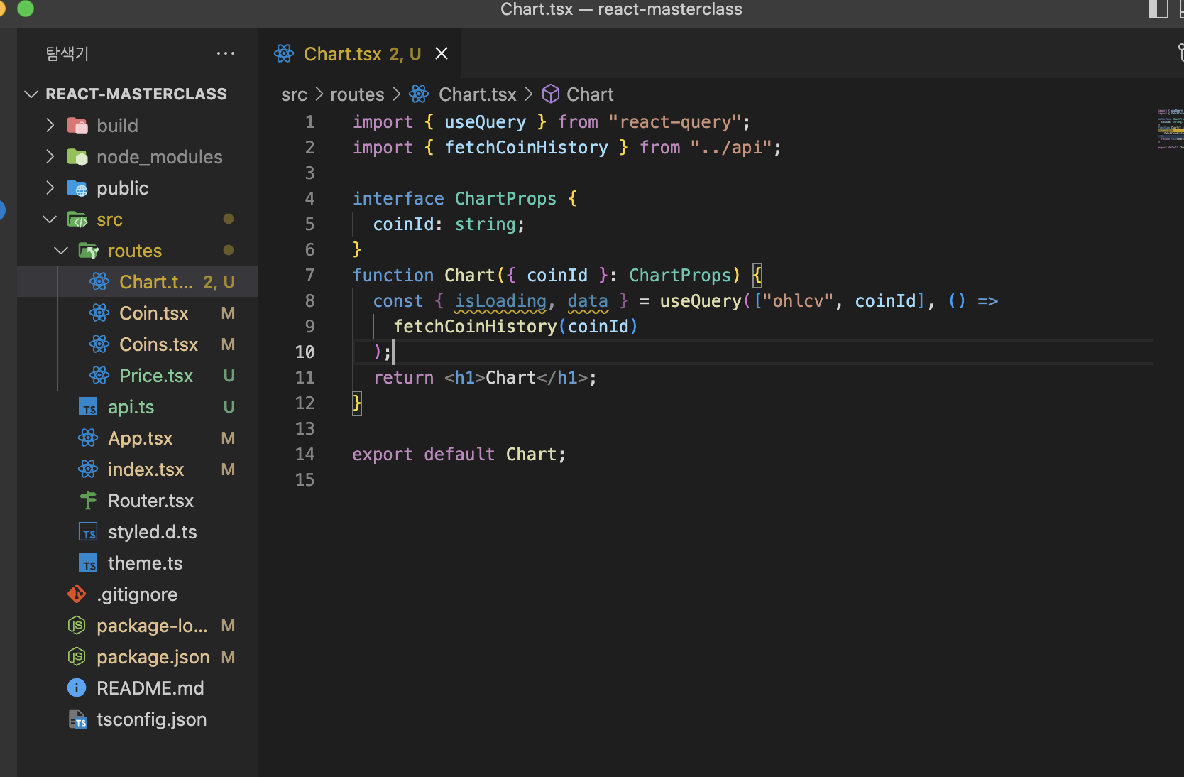 chart.tsx로 가서 useQuery()를 만들어줌. fetcher함수에는 coinId가 필요하므로 argument에 coinID를 넣어줌.