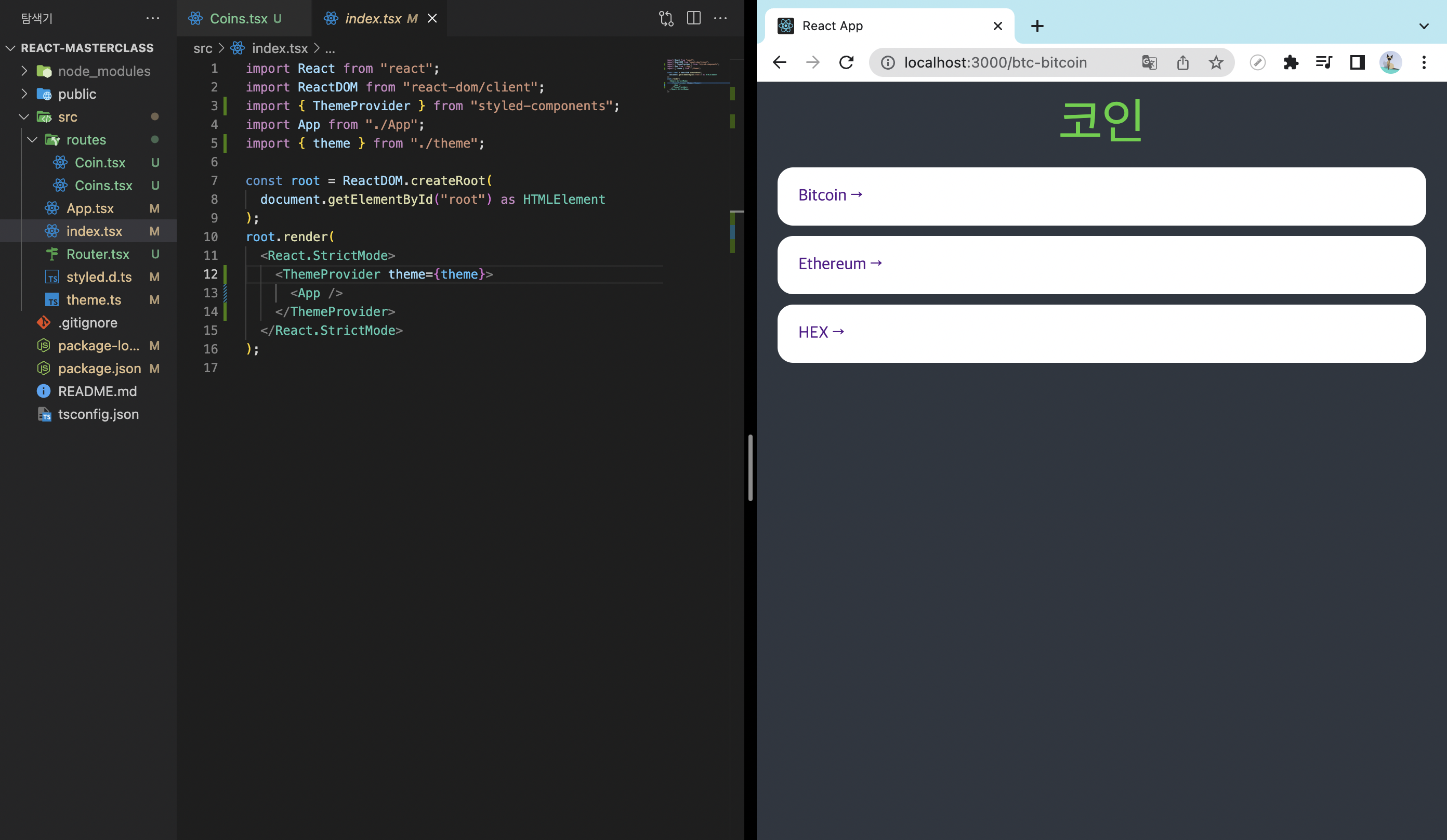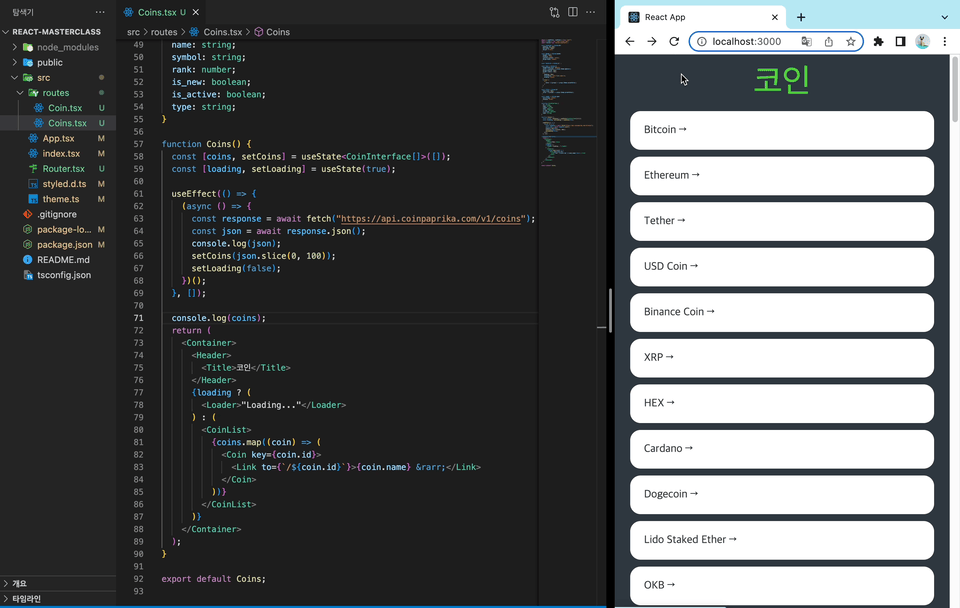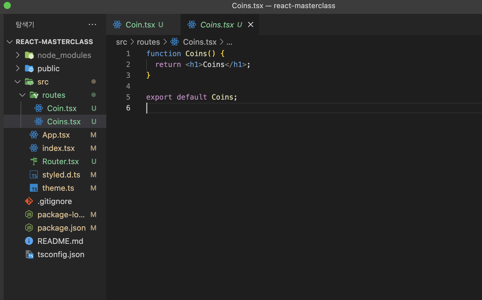 src폴더 안에 routes폴더를 만들어주고 첫번째 스크린인 Coins.tsx파일과 디테일 페이지인 Coin.tsx파일을 만들어줌.