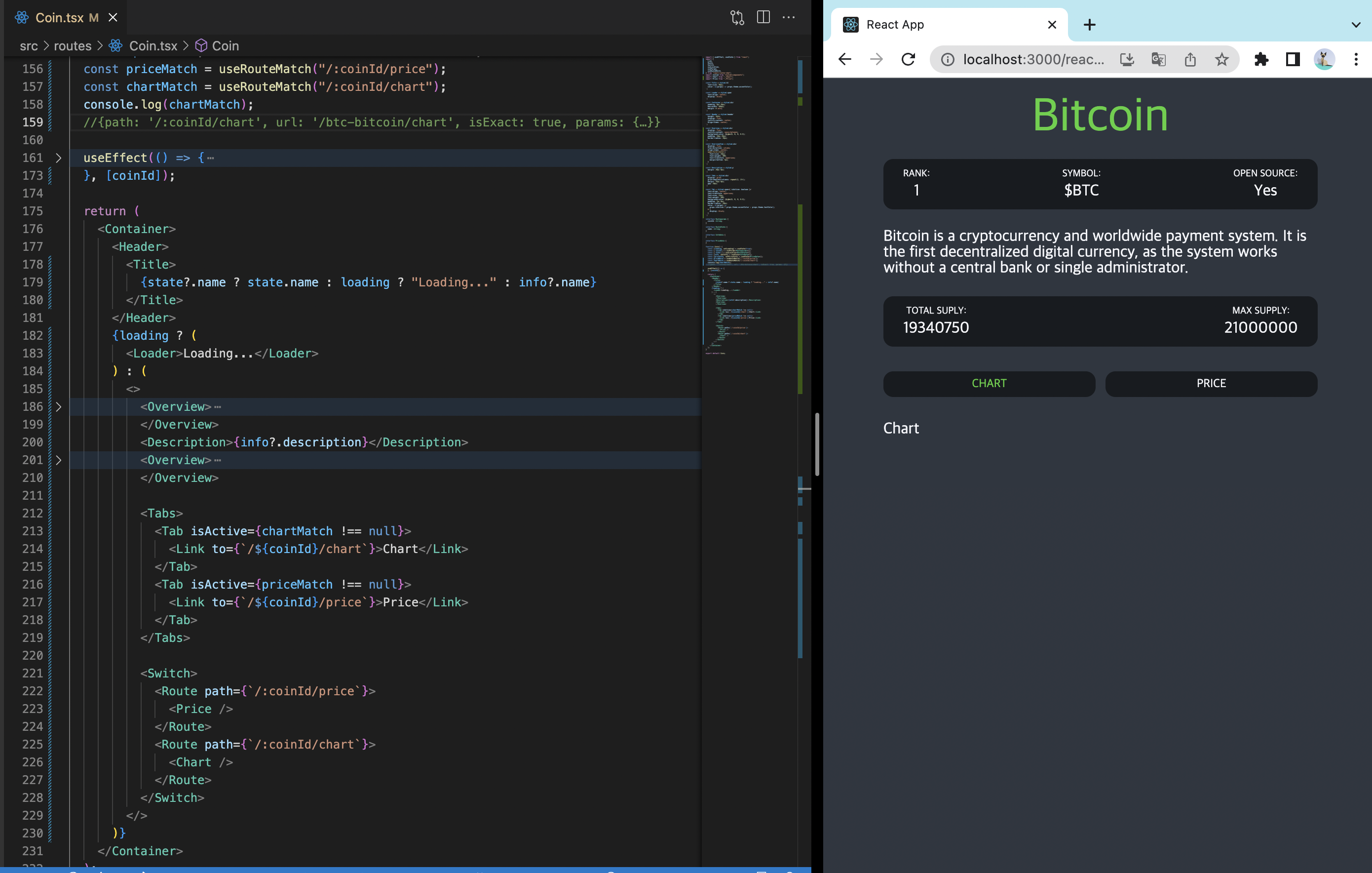 loading ? "Loading..." : info?.name부분은 홈페이지로 부터 온게 아닌 경우에 실행될거임.(path가 / 가 아닌 다른 url로 들어온 경우)Price.tsx와 Chart.tsx 파일을 만들어줌.<Price/>컴포넌트와 <Chart/>컴포넌트가 렌더링 되게 만듦.⭐️ Nested router(중첩라우터)란 route안에 있는 또 다른 route임. 웹사이트에서 탭을 사용할때나 스크린 안에 많은 섹션이 나뉘어진 곳에서 유용하게 쓰임.