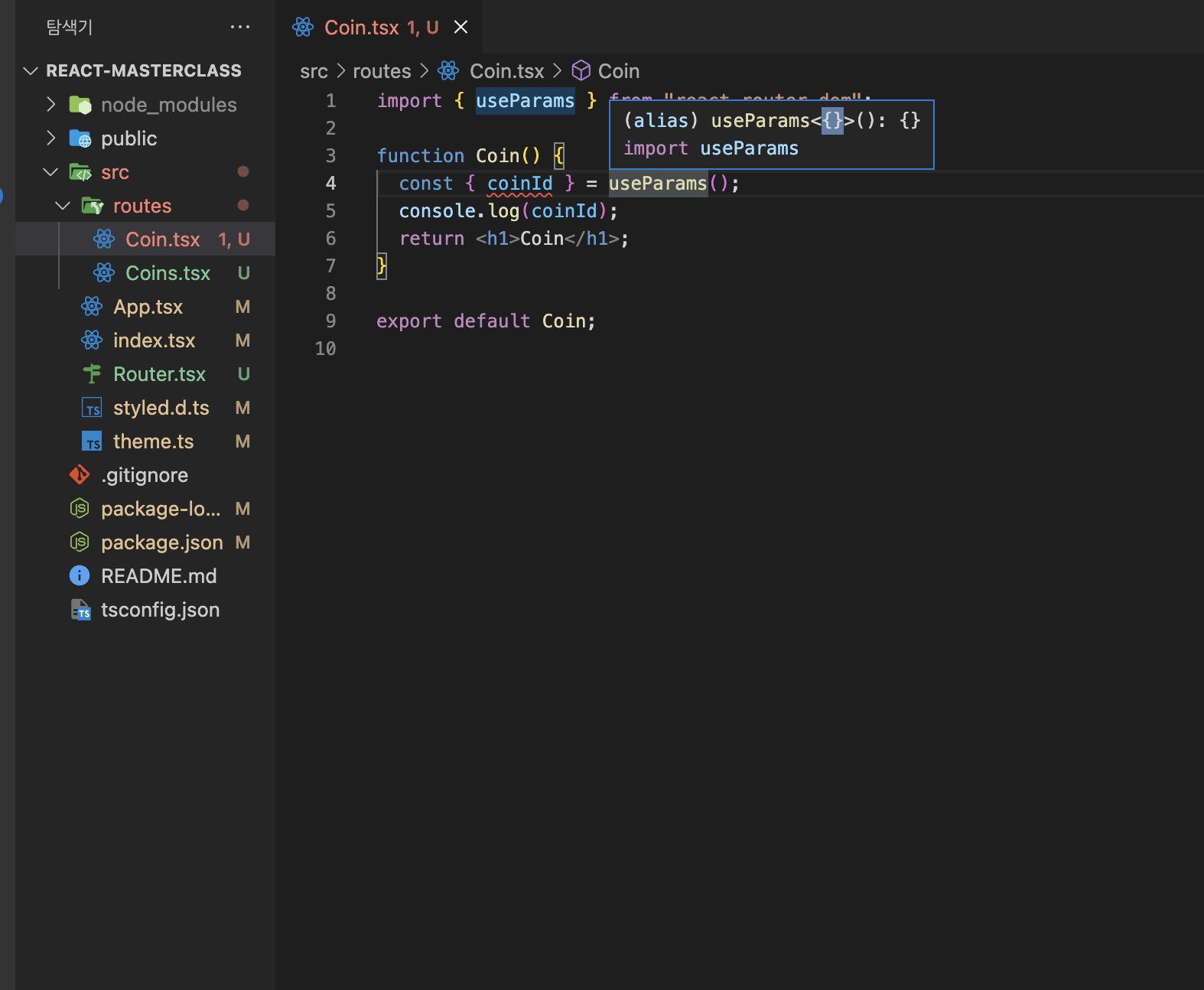 coin.tsx파일에서 URL의 파라미터 부분을 잡아내기 위해서 useParams()를 사용했는데 타입스크립트는 useParams()를 빈 오브젝트라고 생각해서 오류를 내고 있음.