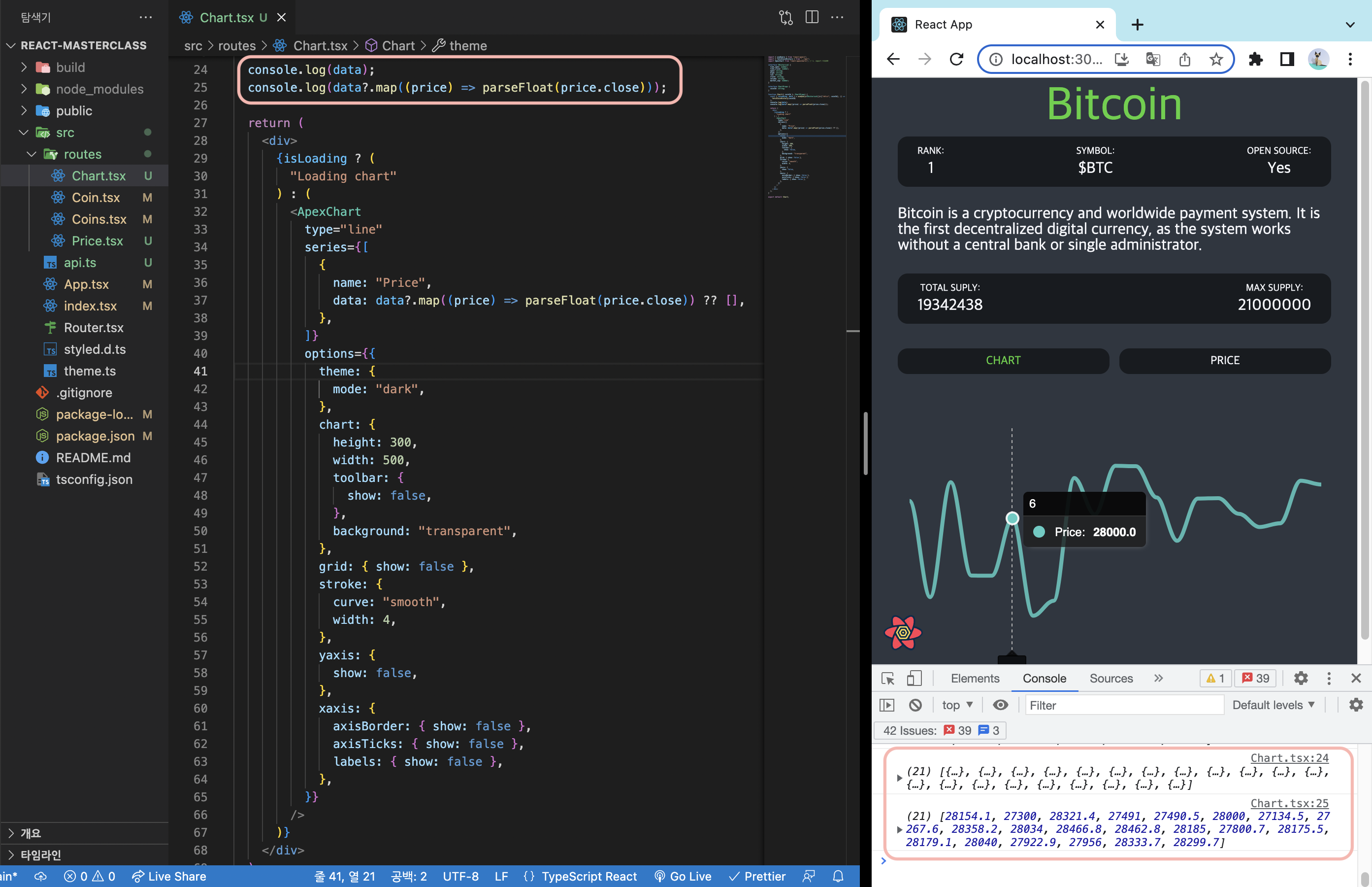$ ${value.toFixed(2)},}categories: data?.map((price) => new Date(price.time_close * 1000).toISOString()) price.time_close를 밀리초로 바꾸기 위해 1000을 곱해줌. 밑의 콘솔창 예시 참고하기