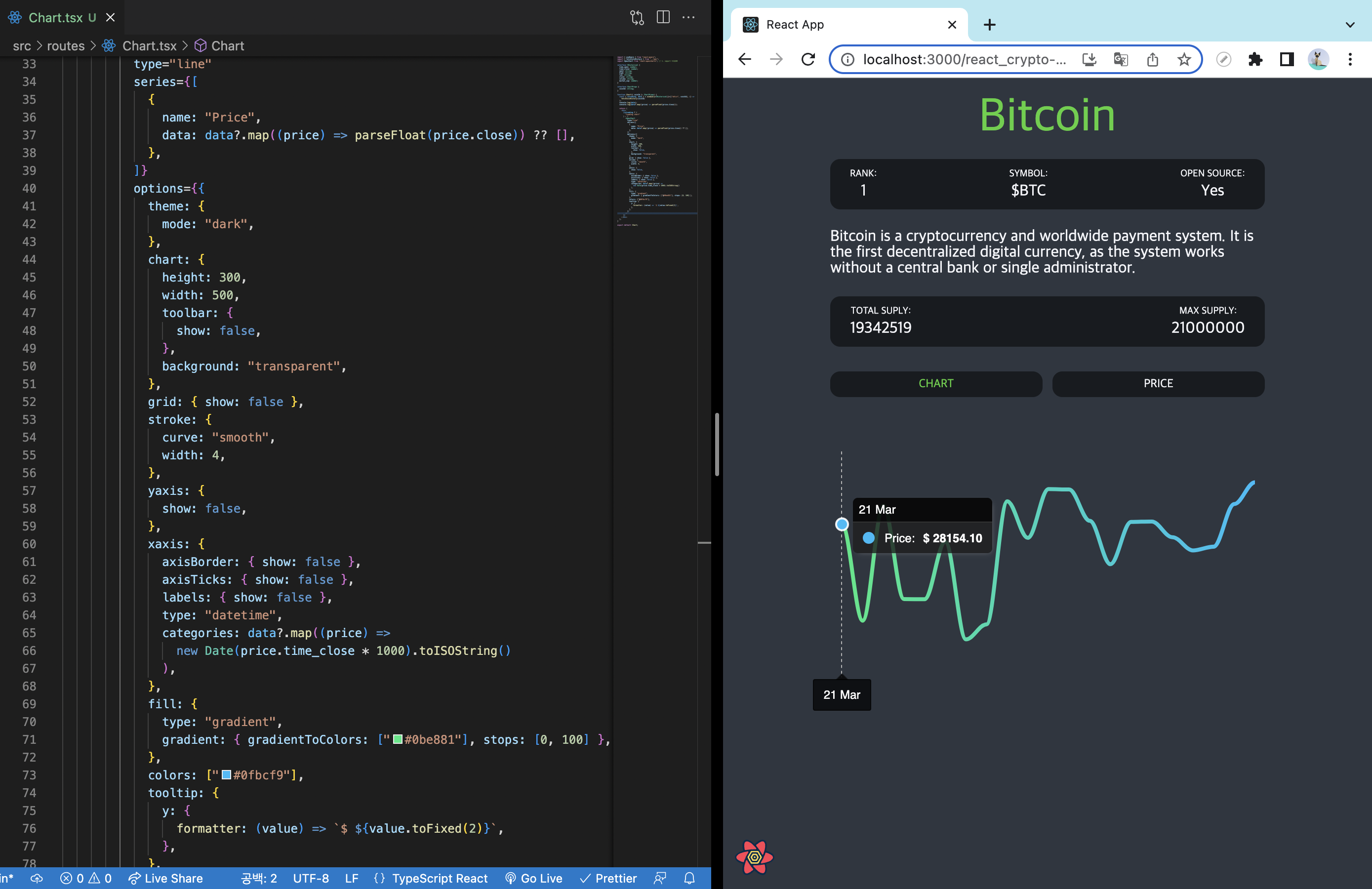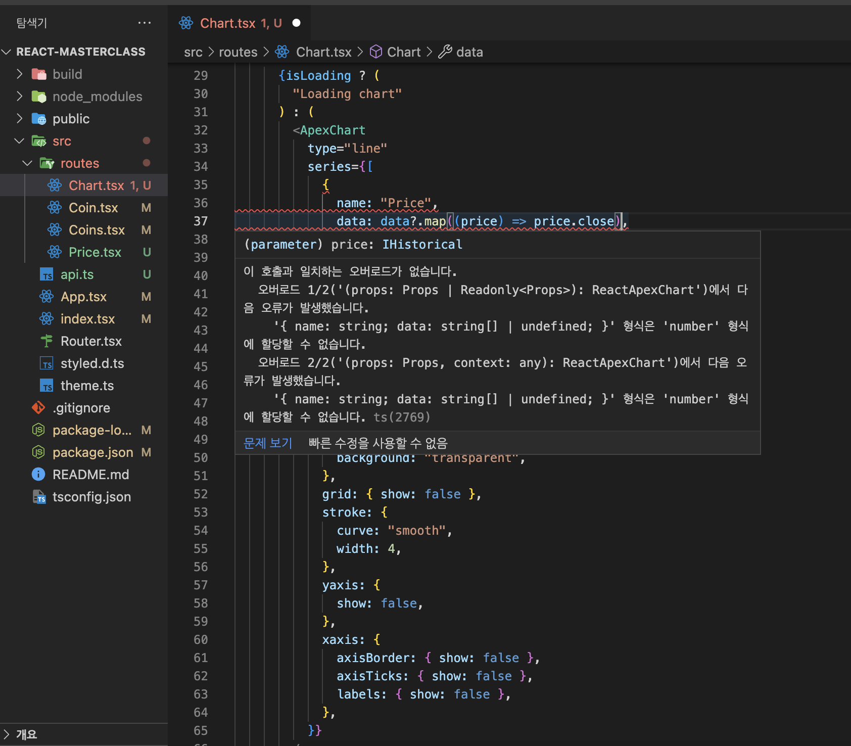 ApexChart를 import 해옴.{isLoading ? "Loading chart" : <ApexChart/>} : 삼항연산자로 isLoading이 true면 "Loading chart"라는 문자가 보이게 false면 <ApexChart/>가 보이게 return 해줌.