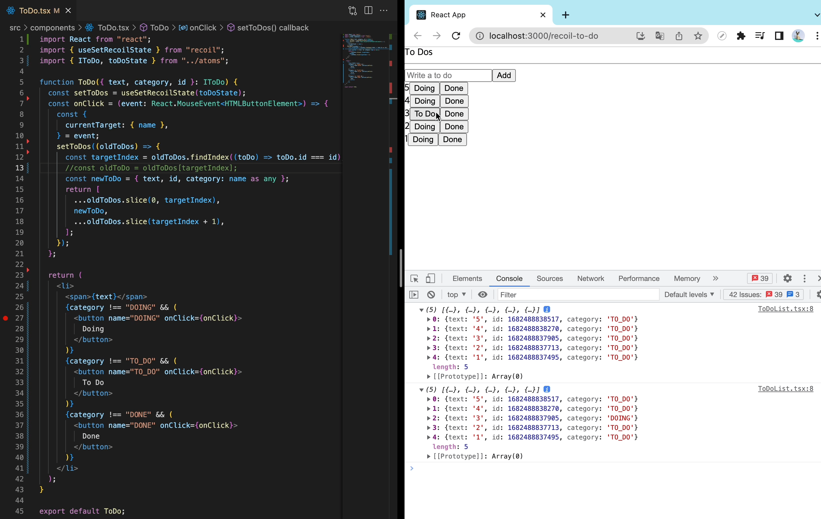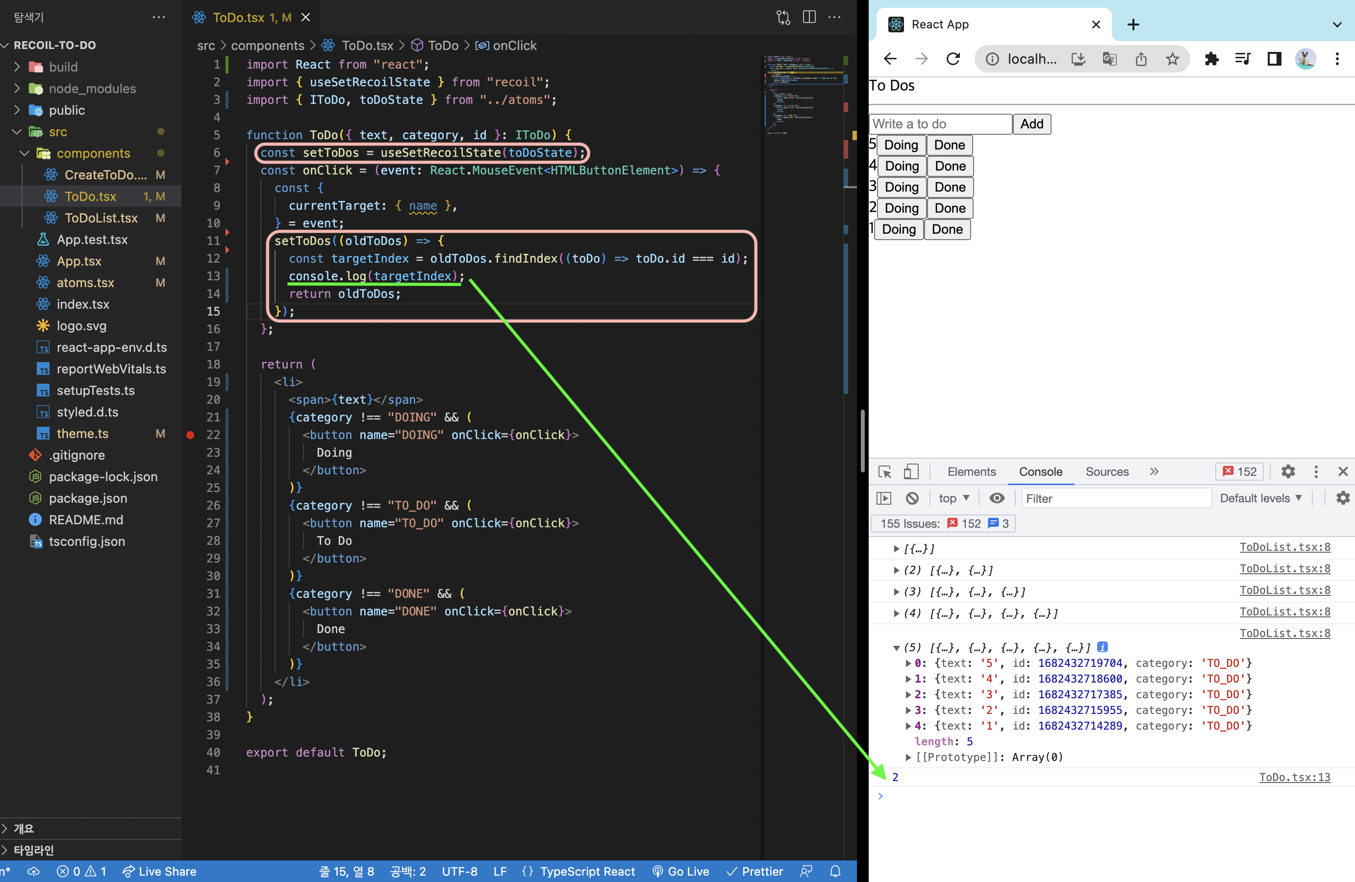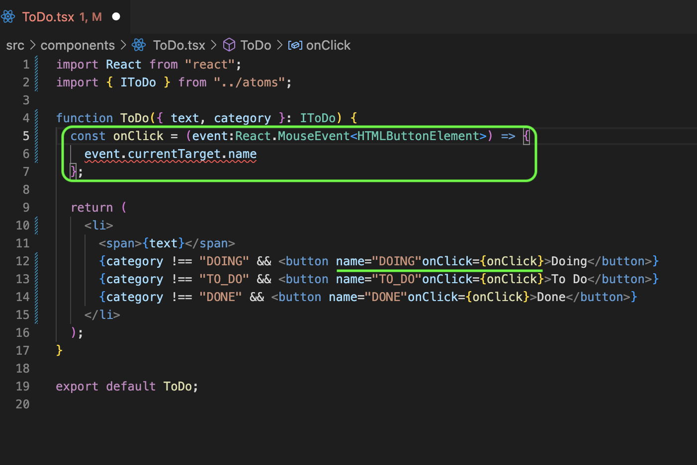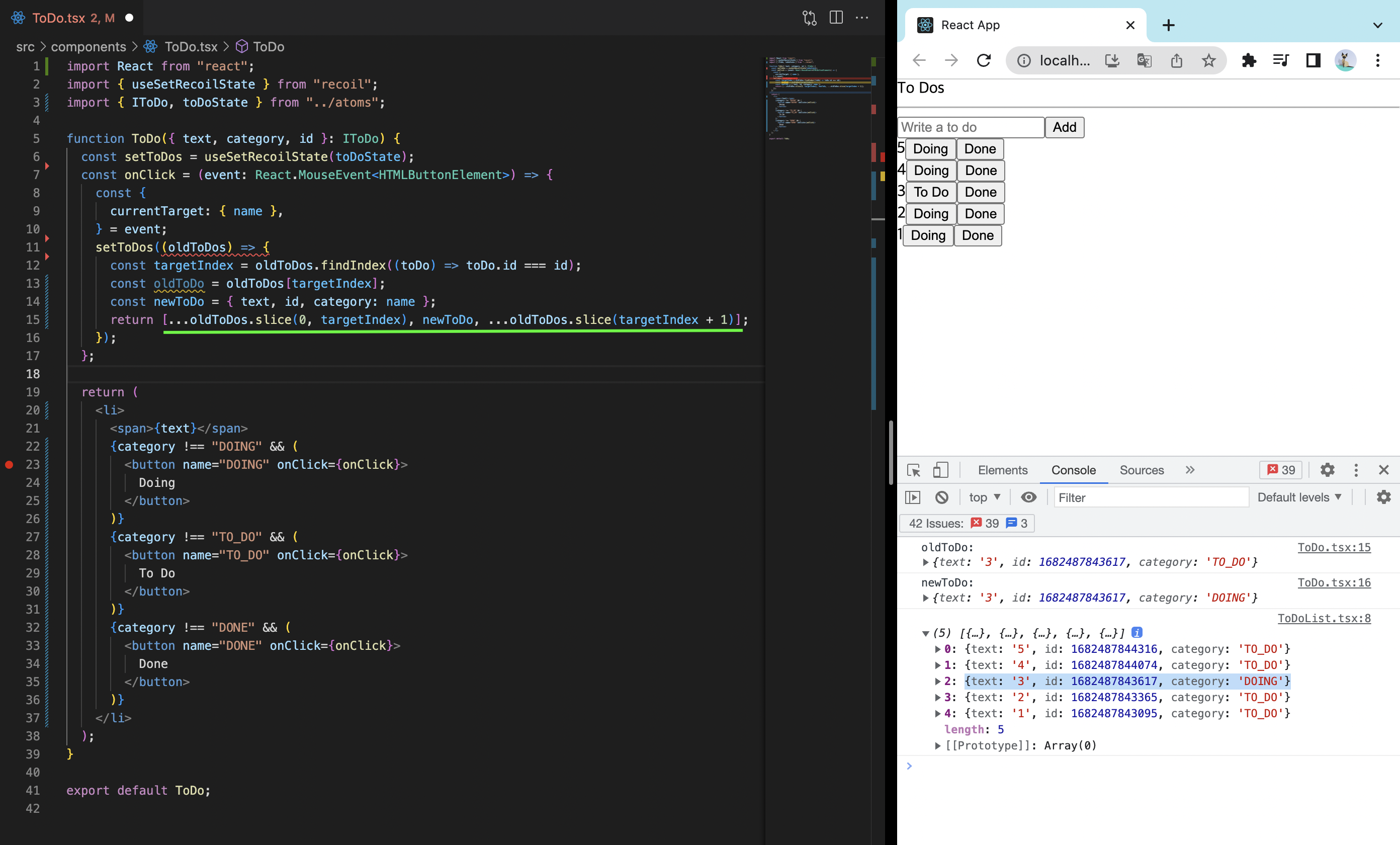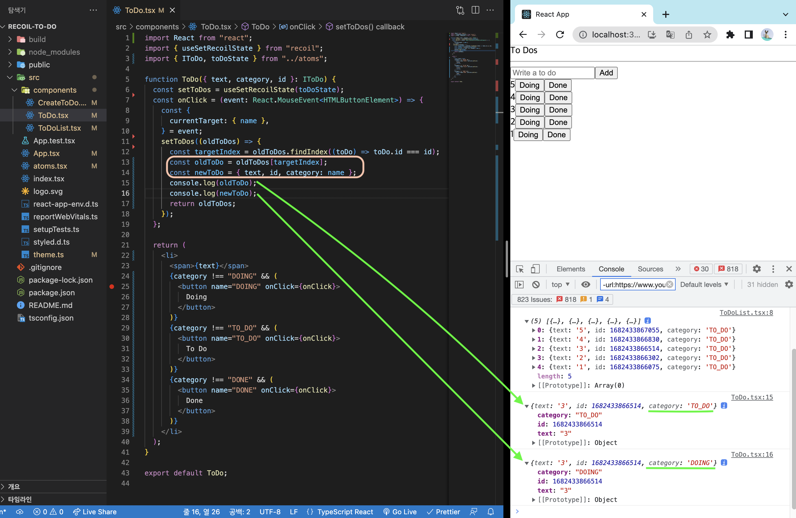 setToDos()에 이전의 state를 oldToDos로 받으면 oldToDos는 배열이기 때문에 구조분해할당으로 []를 벗겨줌.data: IForm은 {toDo}: IForm로 바꿈.{ text: toDo, id: Date.now(), category: "TO_DO" }로 interface 정한 값이랑 똑같이 들어오게 해줌.이제 할 일을 완료할 수 있는 기능을 추가하기위해 "TO_DO"를 클릭하면 "DOING"이나 "DONE"으로 또는 반대로도 바뀔 수 있게 만들거임.