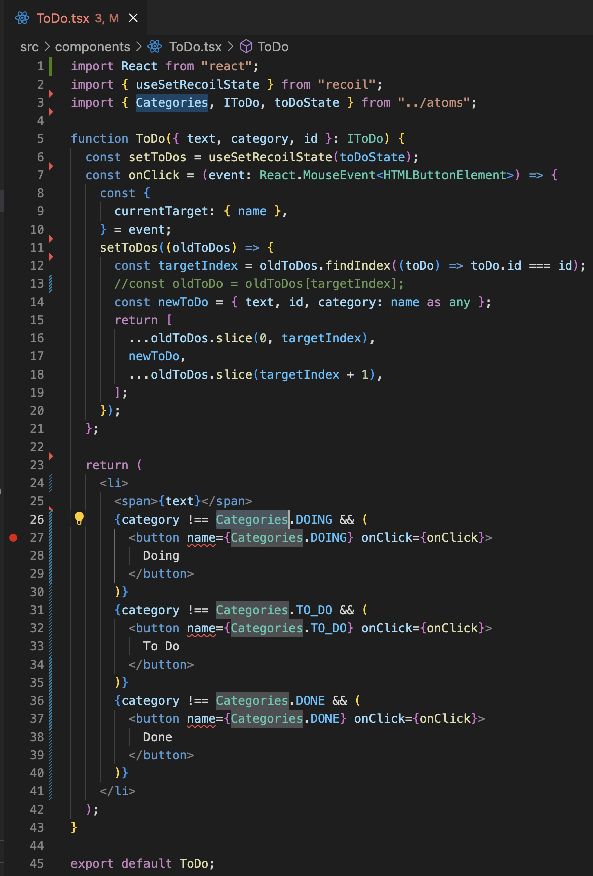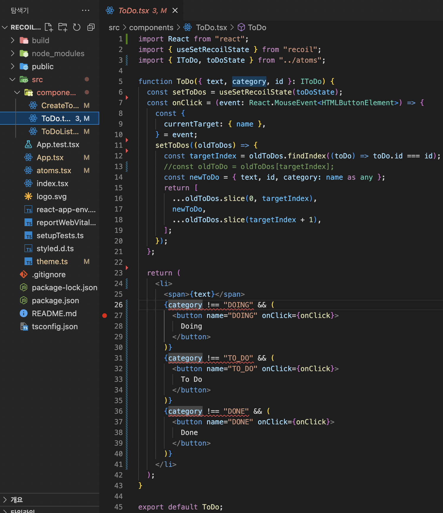 -> 이번 강의에서는 categoryState에 따라서, 새 toDo의 카테고리가 정해지도록 고쳐보자!