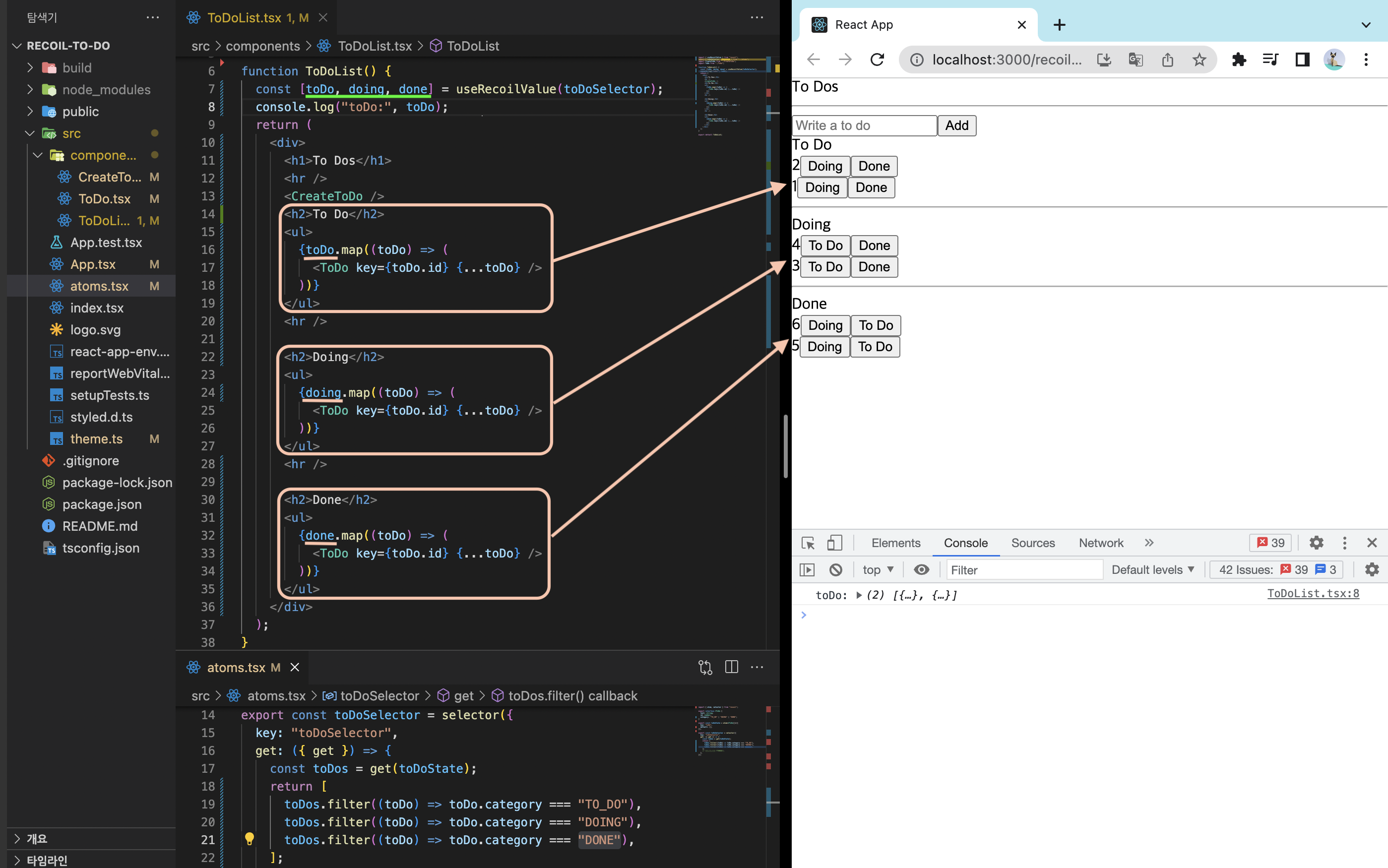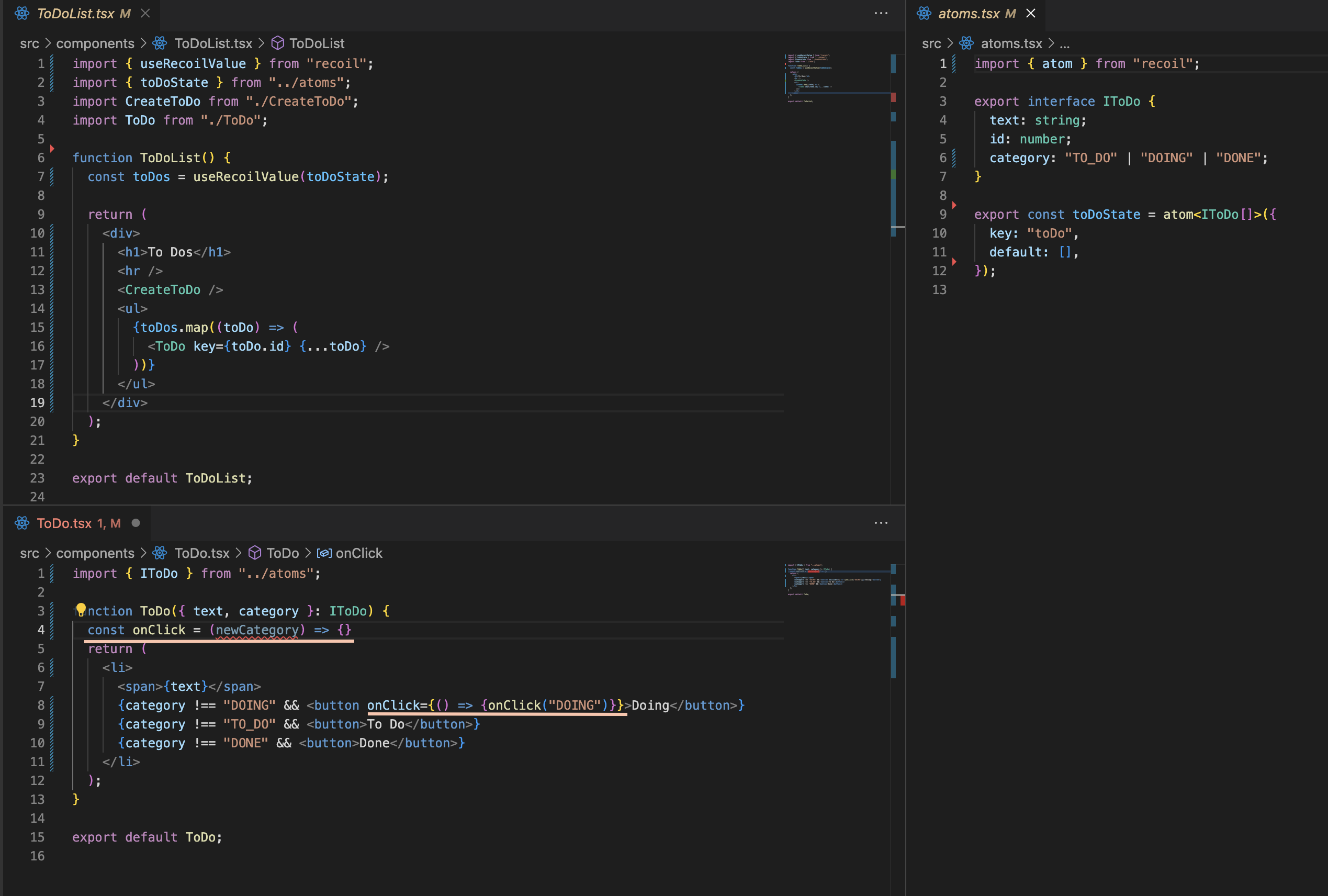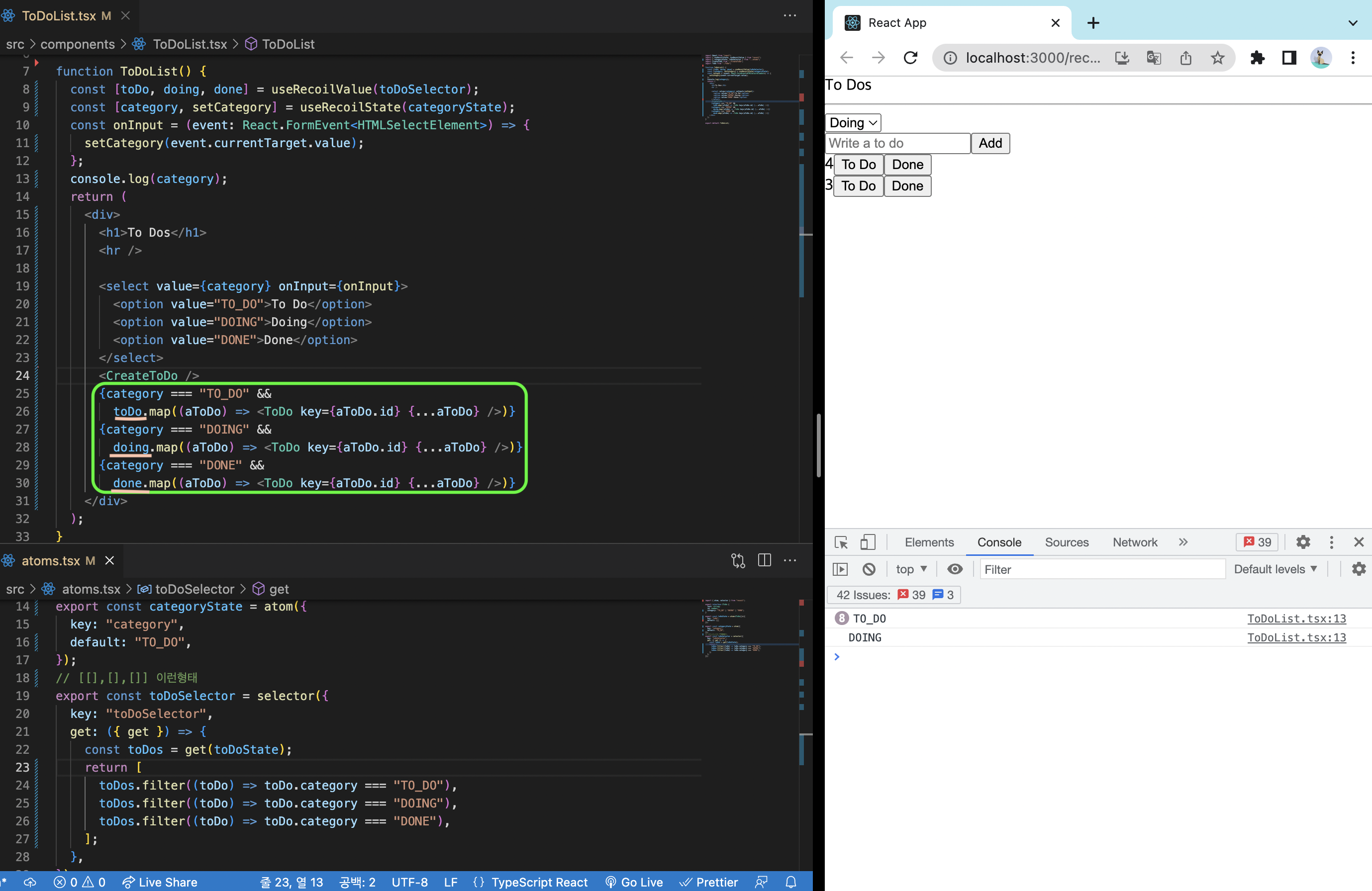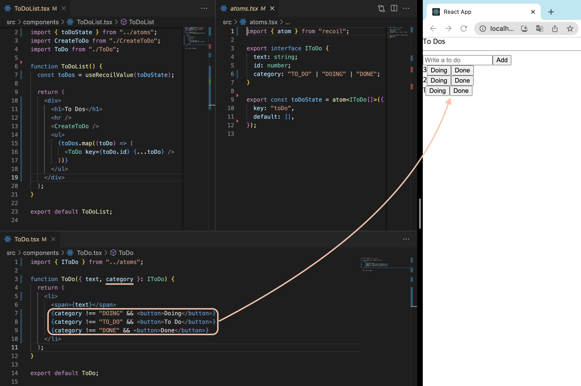 [["TO_DO"에 속한 todo], ["DOING"에 속한 todo], ["DONE"에 속한 todo]]이제 각각의 카테고리에 있는 toDo를 한 화면에 렌더링 되게 코드를 바꿔주자.