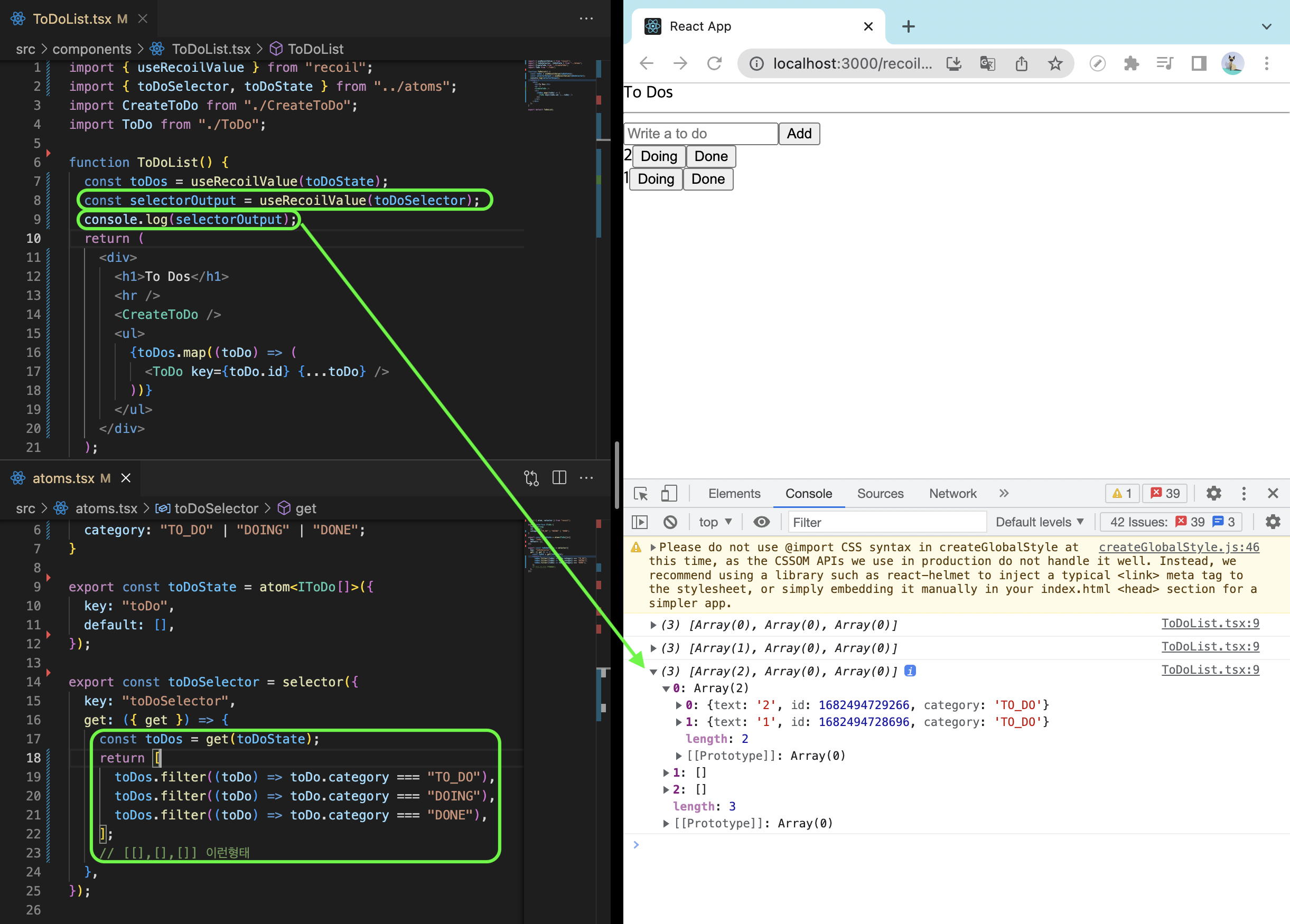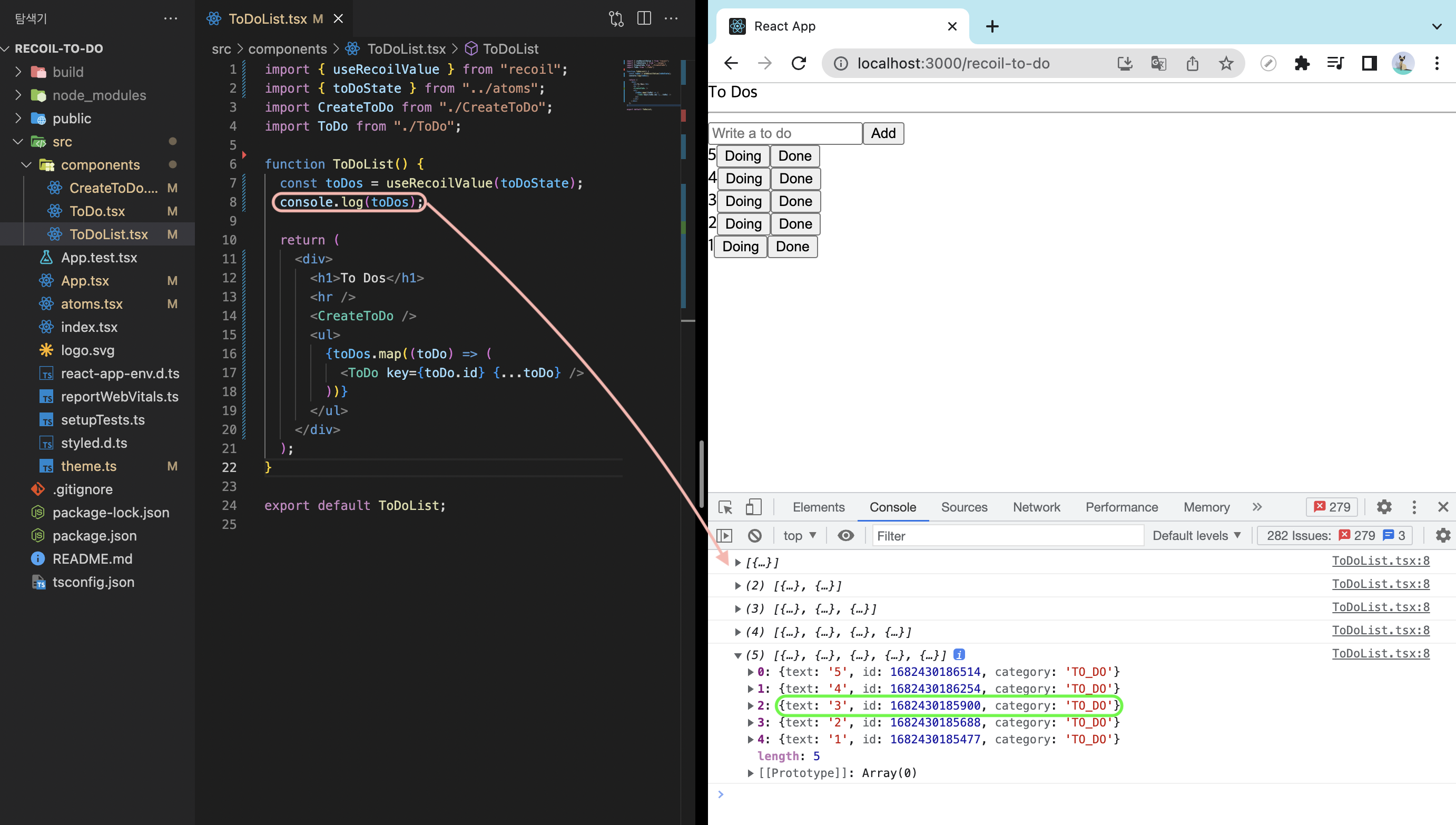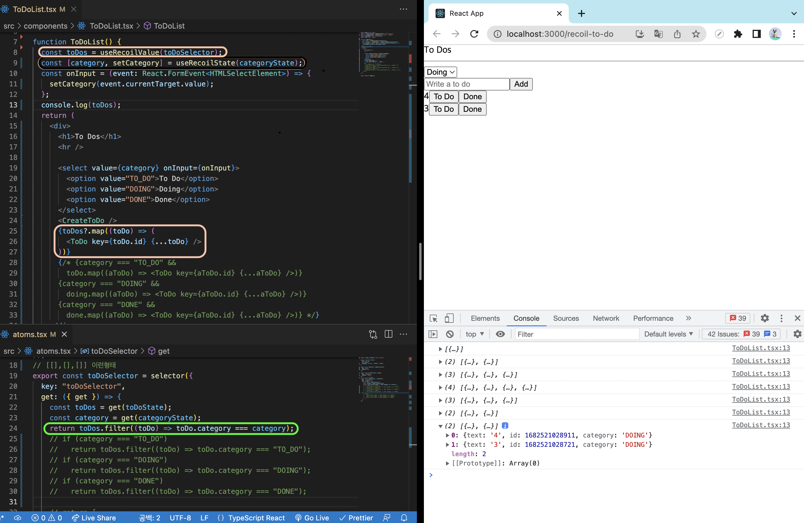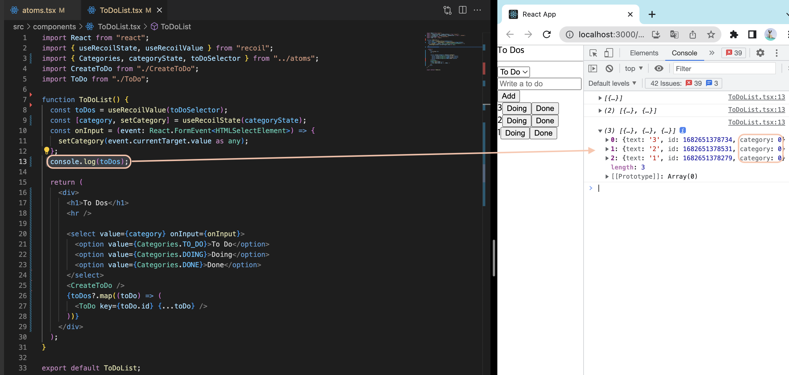 [["TO_DO"에 속한 todo], ["DOING"에 속한 todo], ["DONE"에 속한 todo]]이제 각각의 카테고리에 있는 toDo를 한 화면에 렌더링 되게 코드를 바꿔주자.