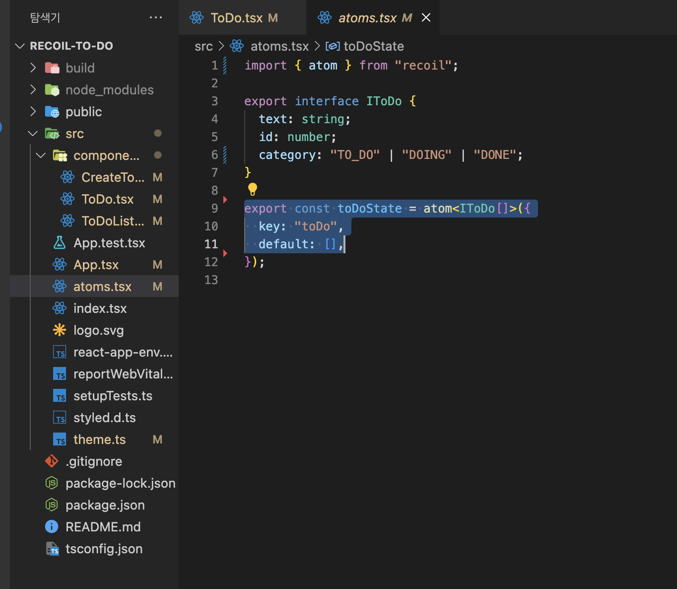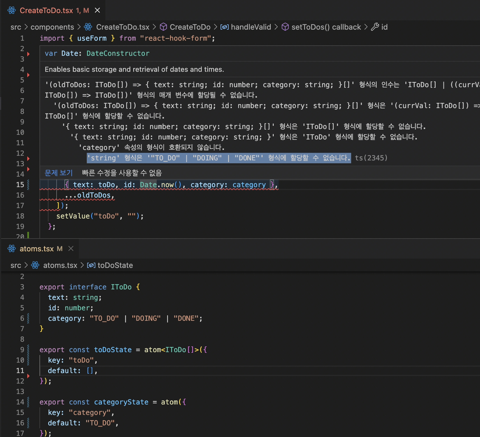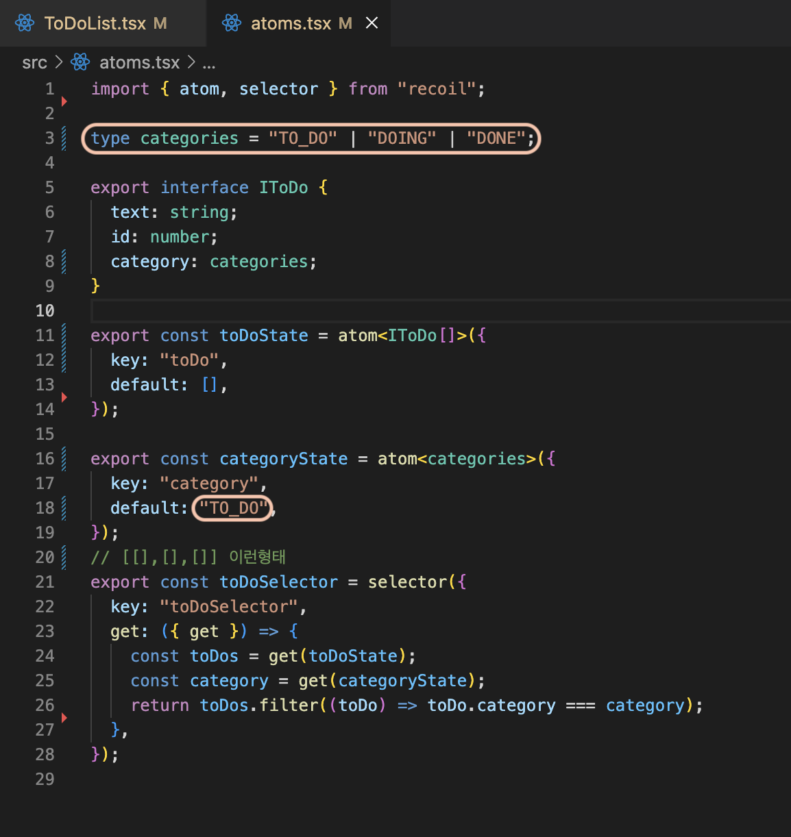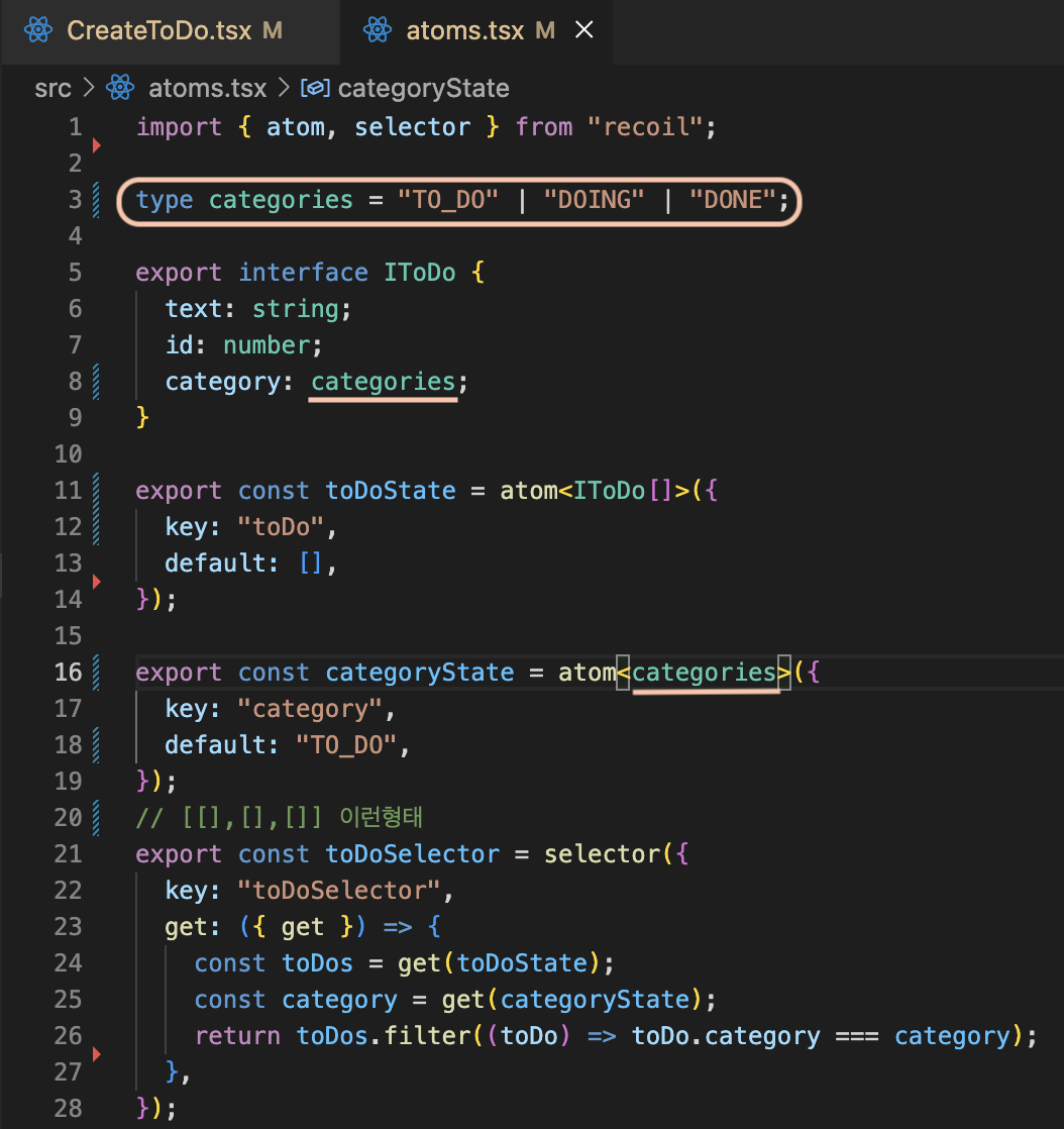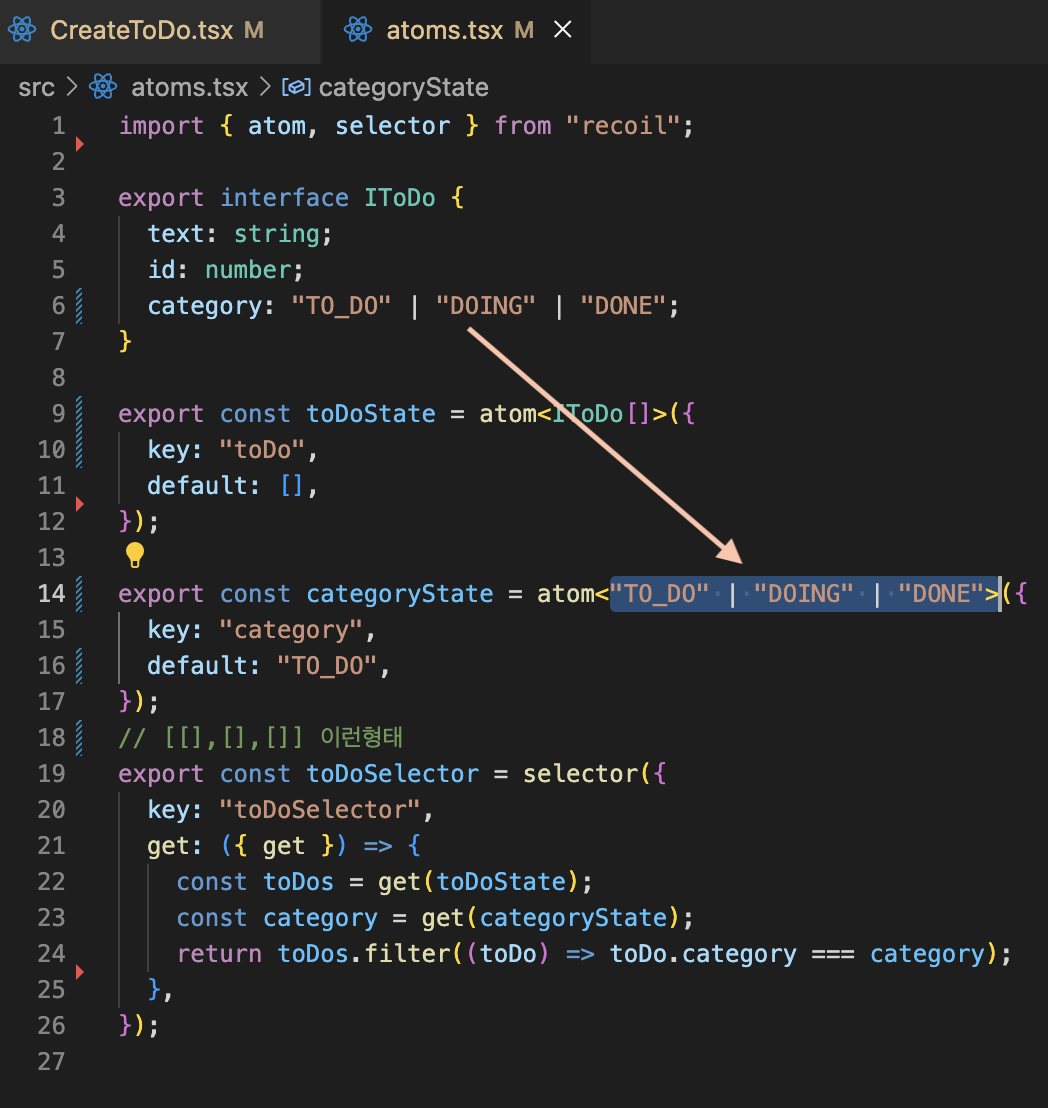 atoms.tsx파일로 가서 위와 같이 타입스크립트에게 categoryState가 세 개 중의 하나일 거라고 알려주면 해결됨!