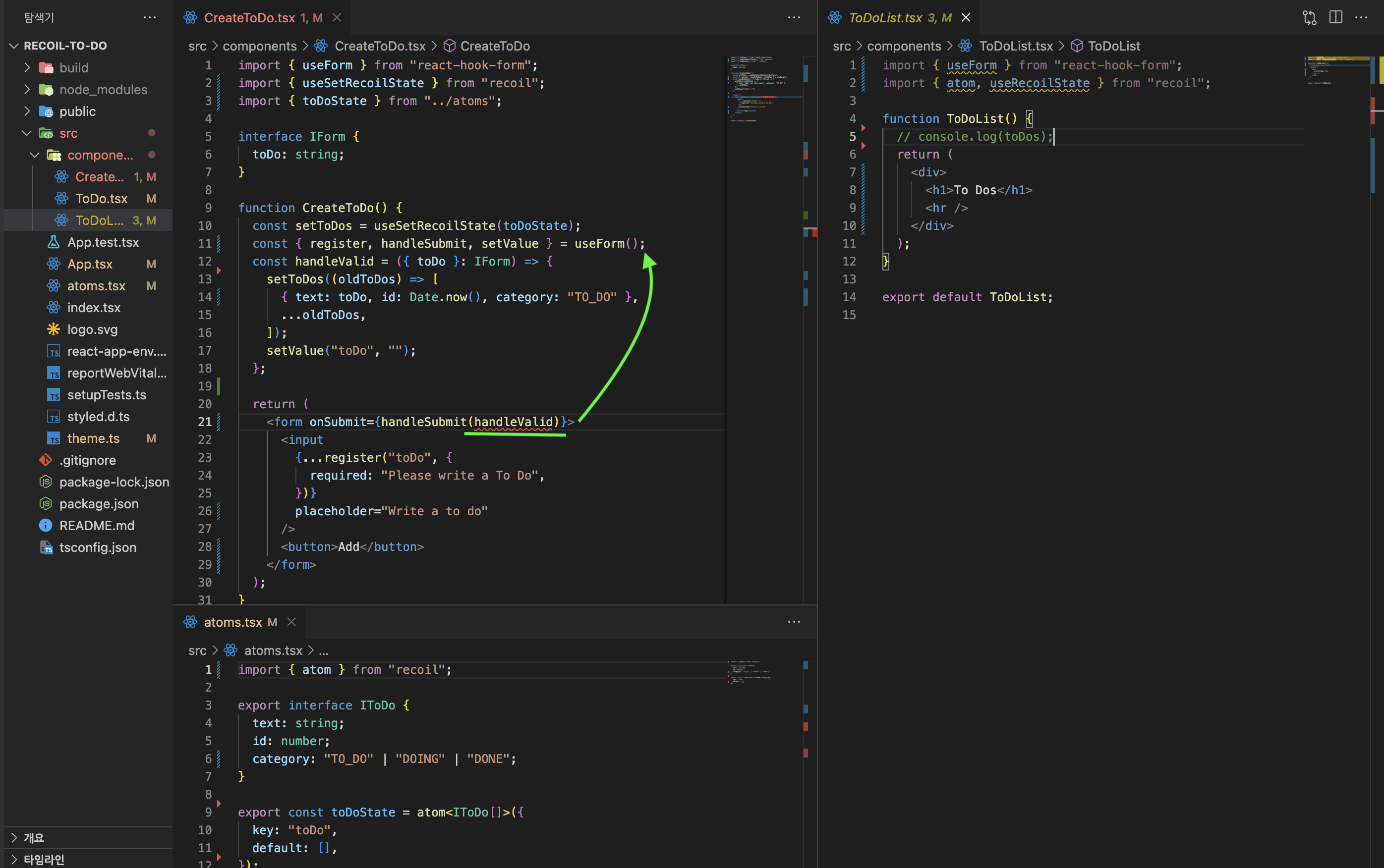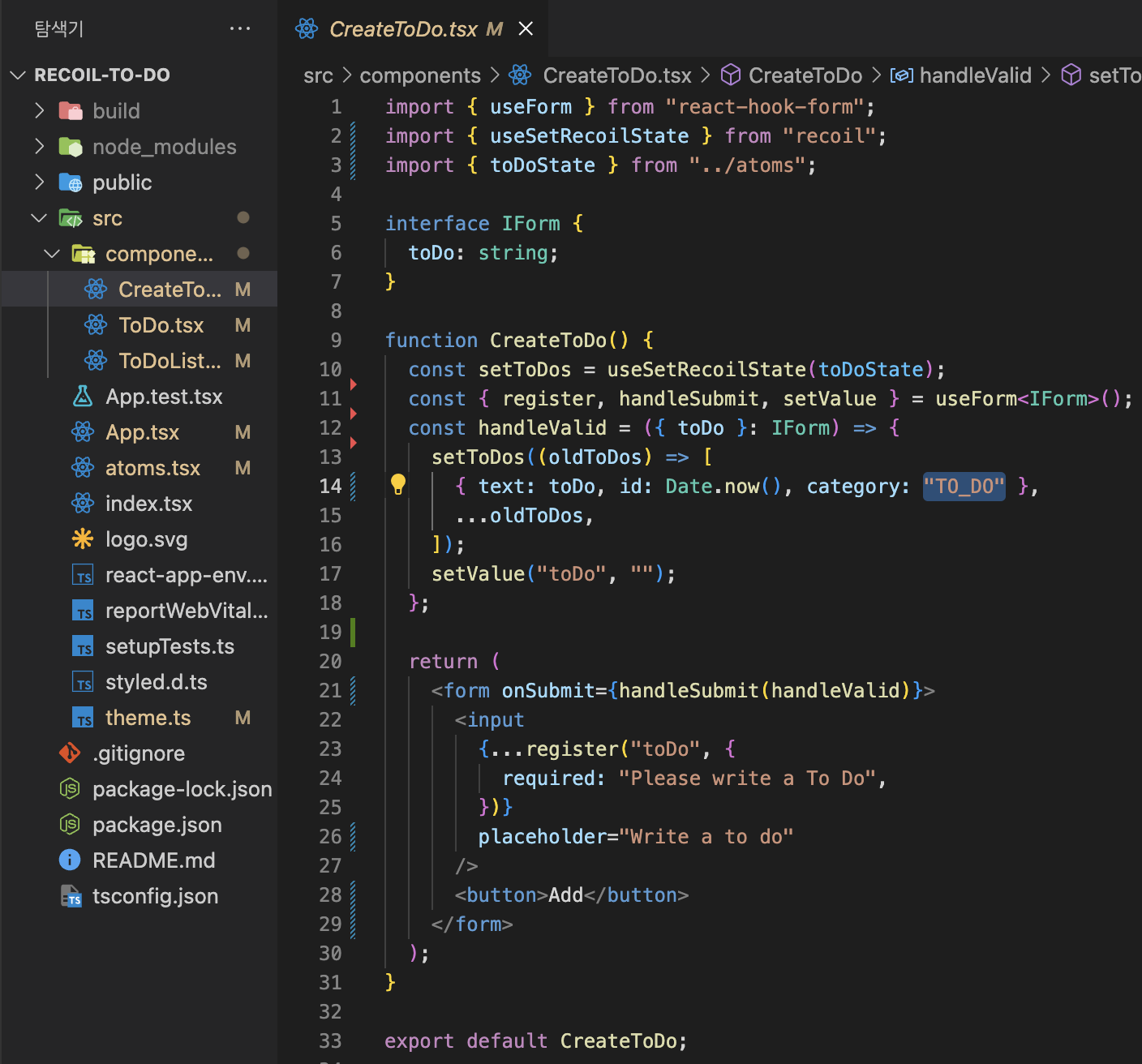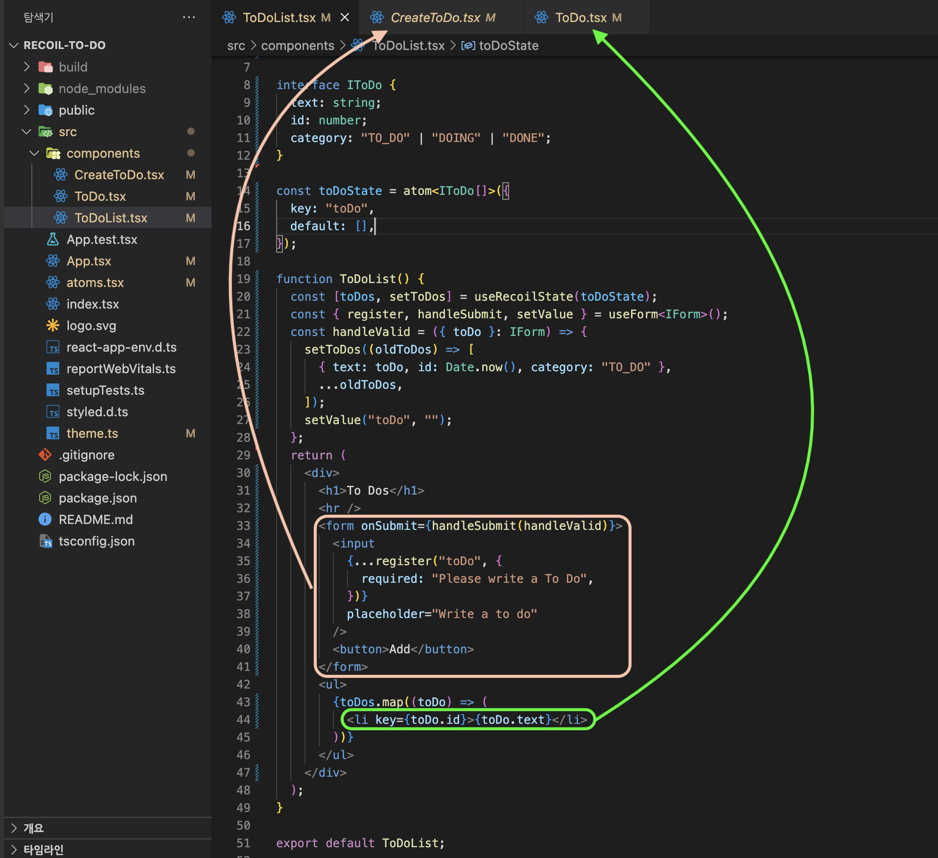 CreateToDo.tsx 와 ToDo.tsx 파일을 만들어주고 form을 CreateToDo.tsx로 옮겨줌 (li는 나중에 옮겨줄거임.)