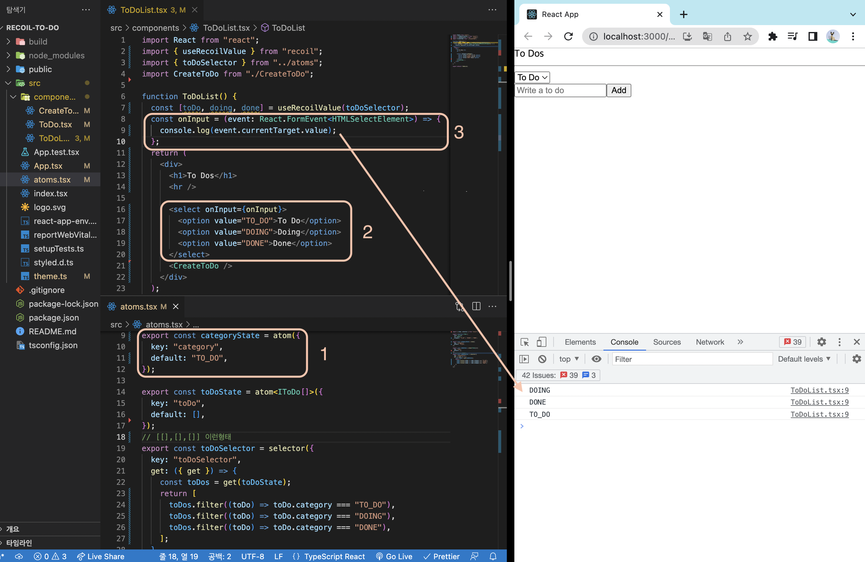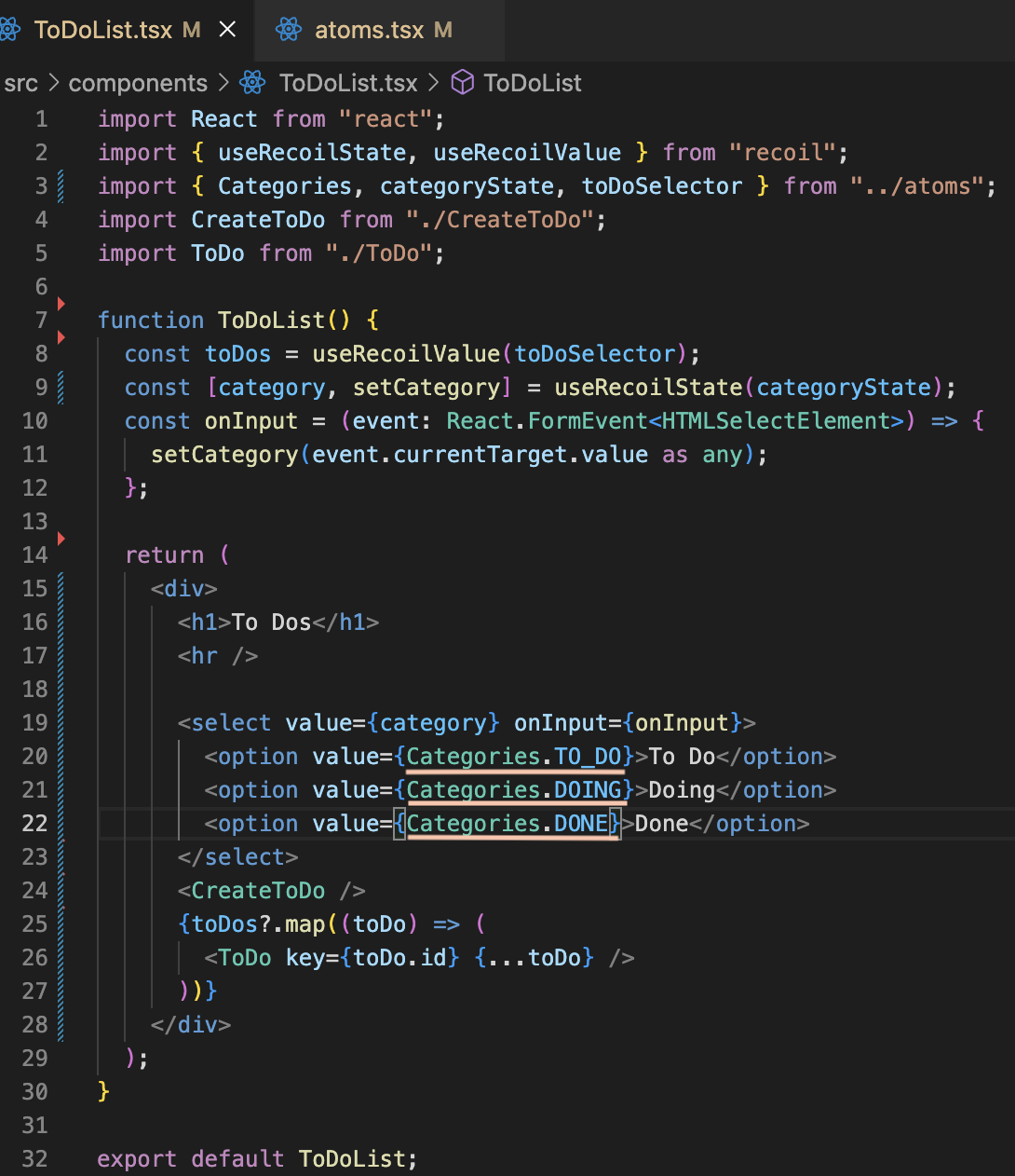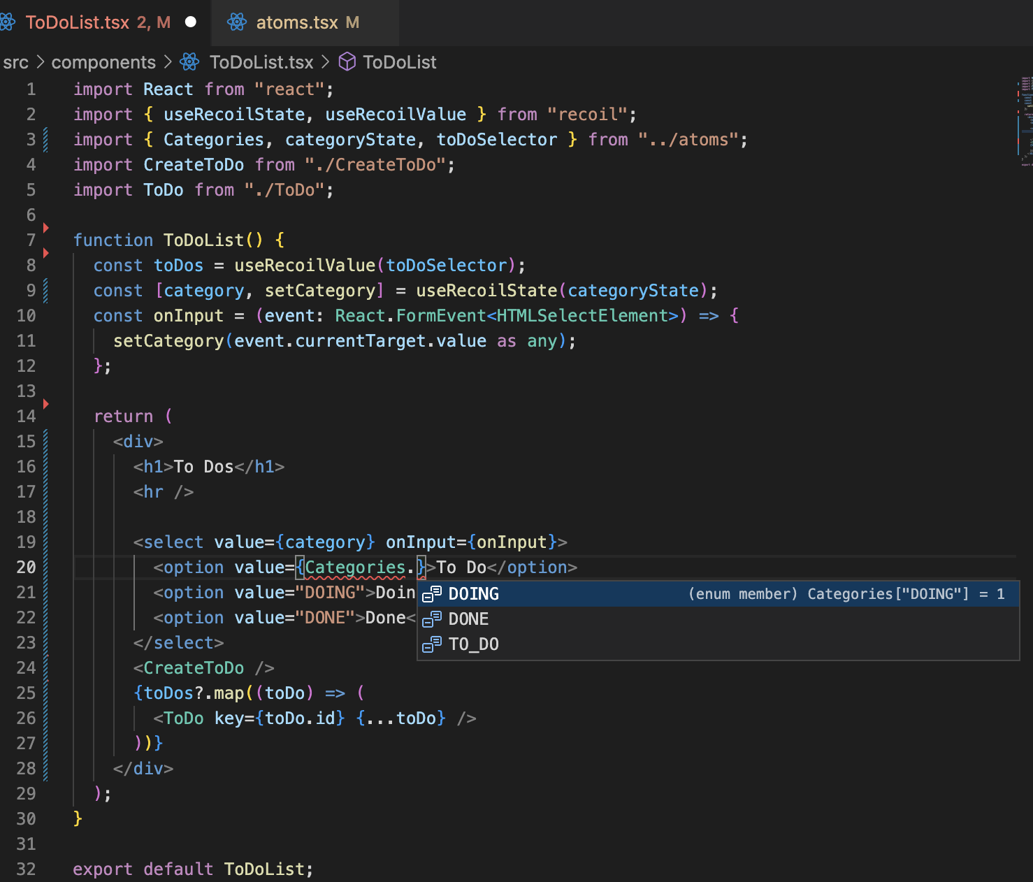 useRecoilState()로 atom의 value값과 수정함수를 만들어 줌.option에 To do, Doing, Done 순으로 하셔서 필요성을 못느끼셨겠지만 Doing, Done, To do 순으로 하셔도