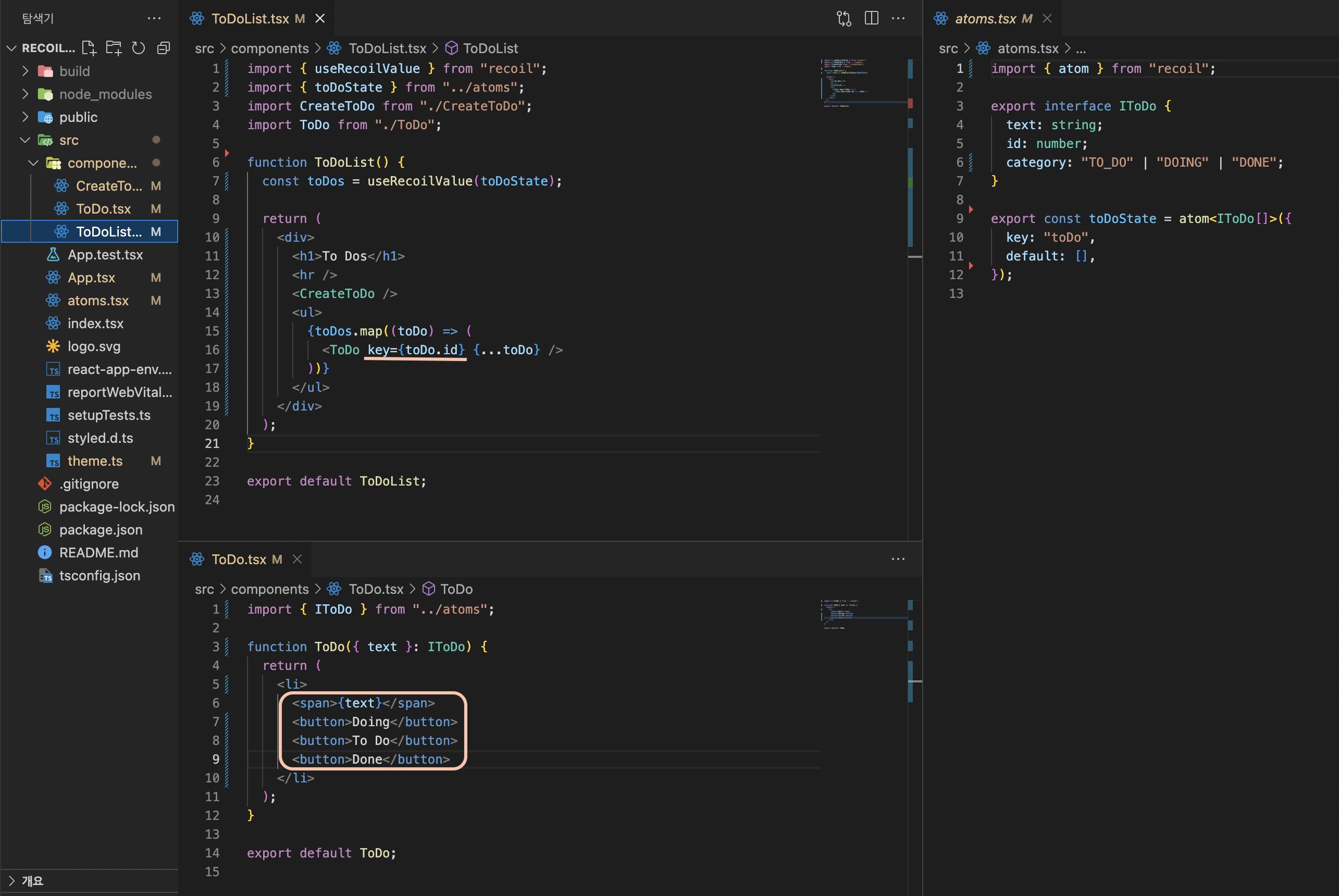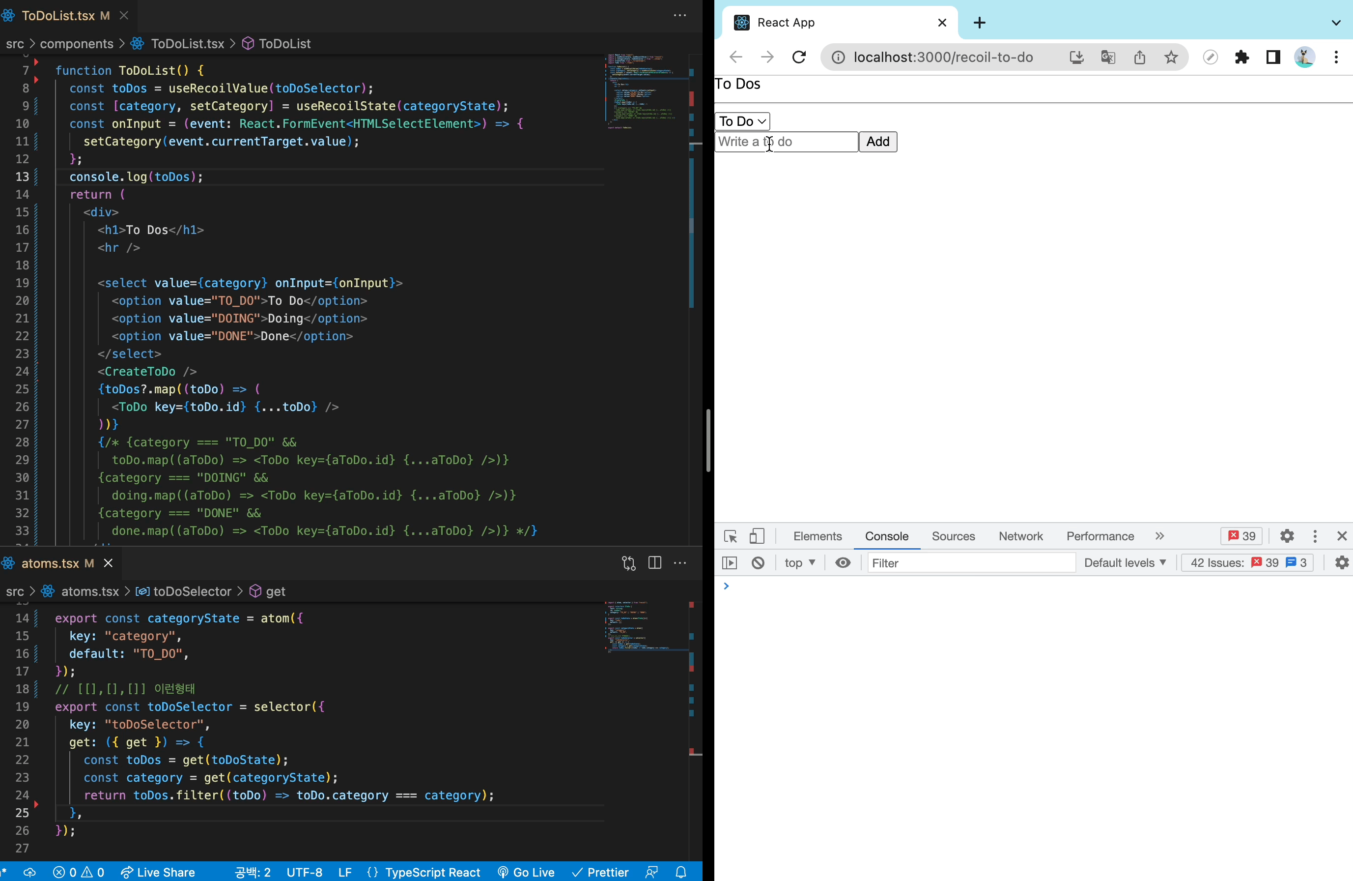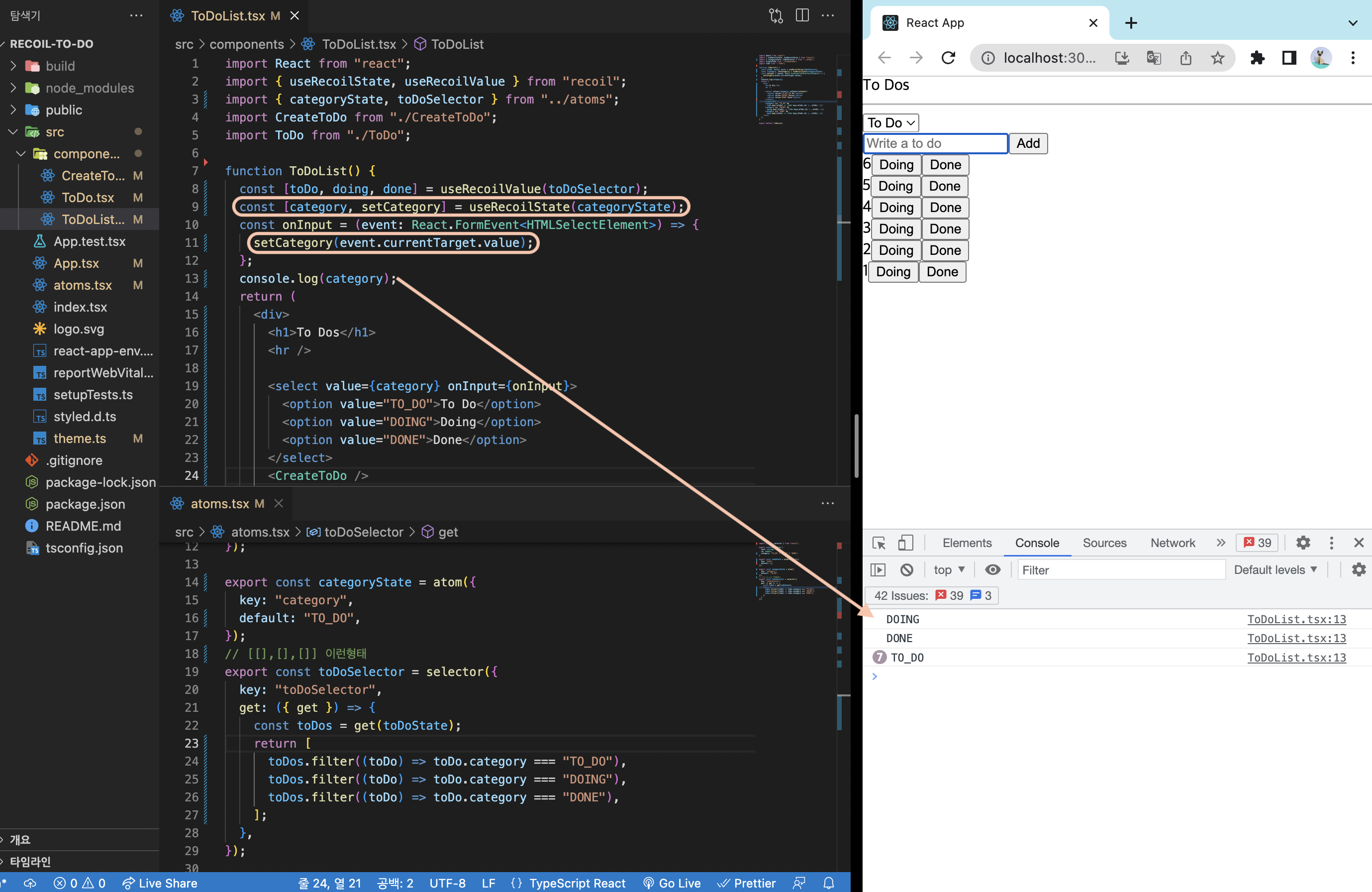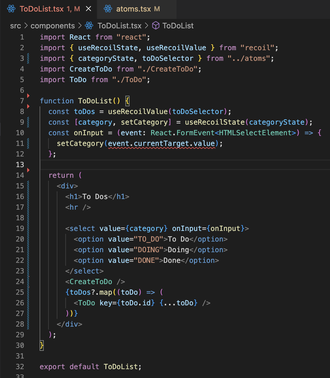 useRecoilState()로 atom의 value값과 수정함수를 만들어 줌.option에 To do, Doing, Done 순으로 하셔서 필요성을 못느끼셨겠지만 Doing, Done, To do 순으로 하셔도