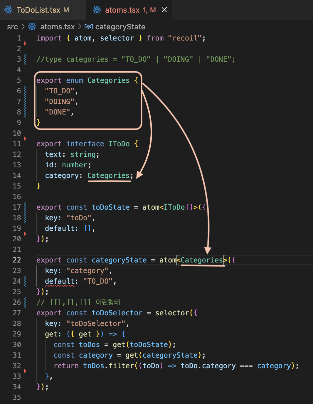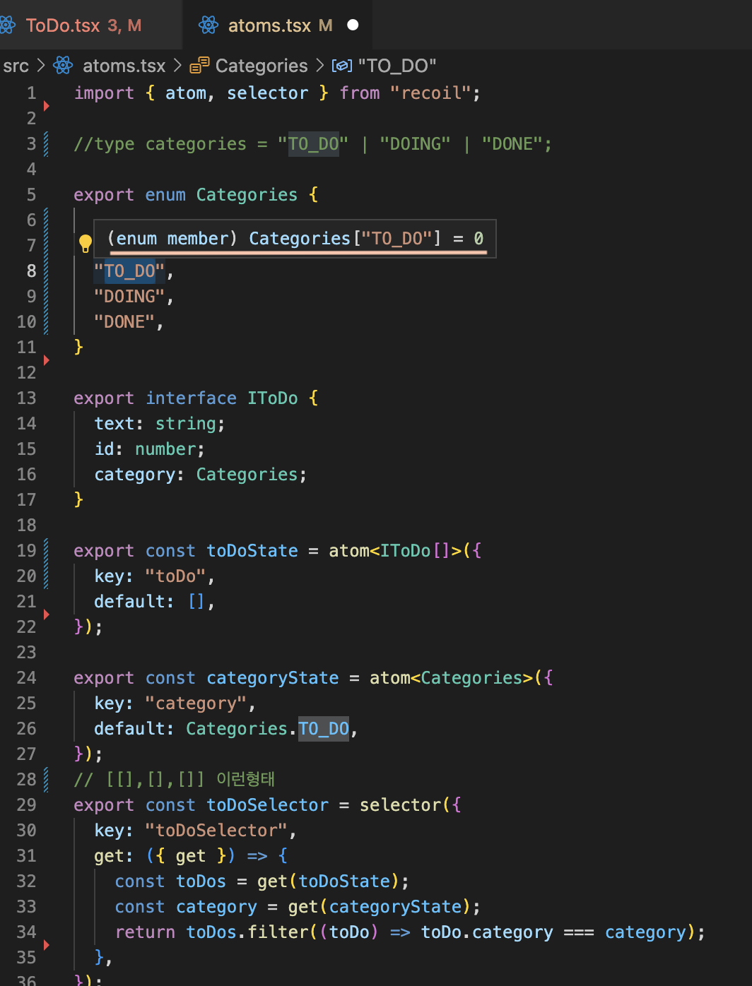 atoms.tsx에 가서 Categories를 살펴보면, Categories["TO_DO"]의 값은 사실 0이고 나머지 는 각각 1,2로 숫자임.{Categories.DOING + ""}
