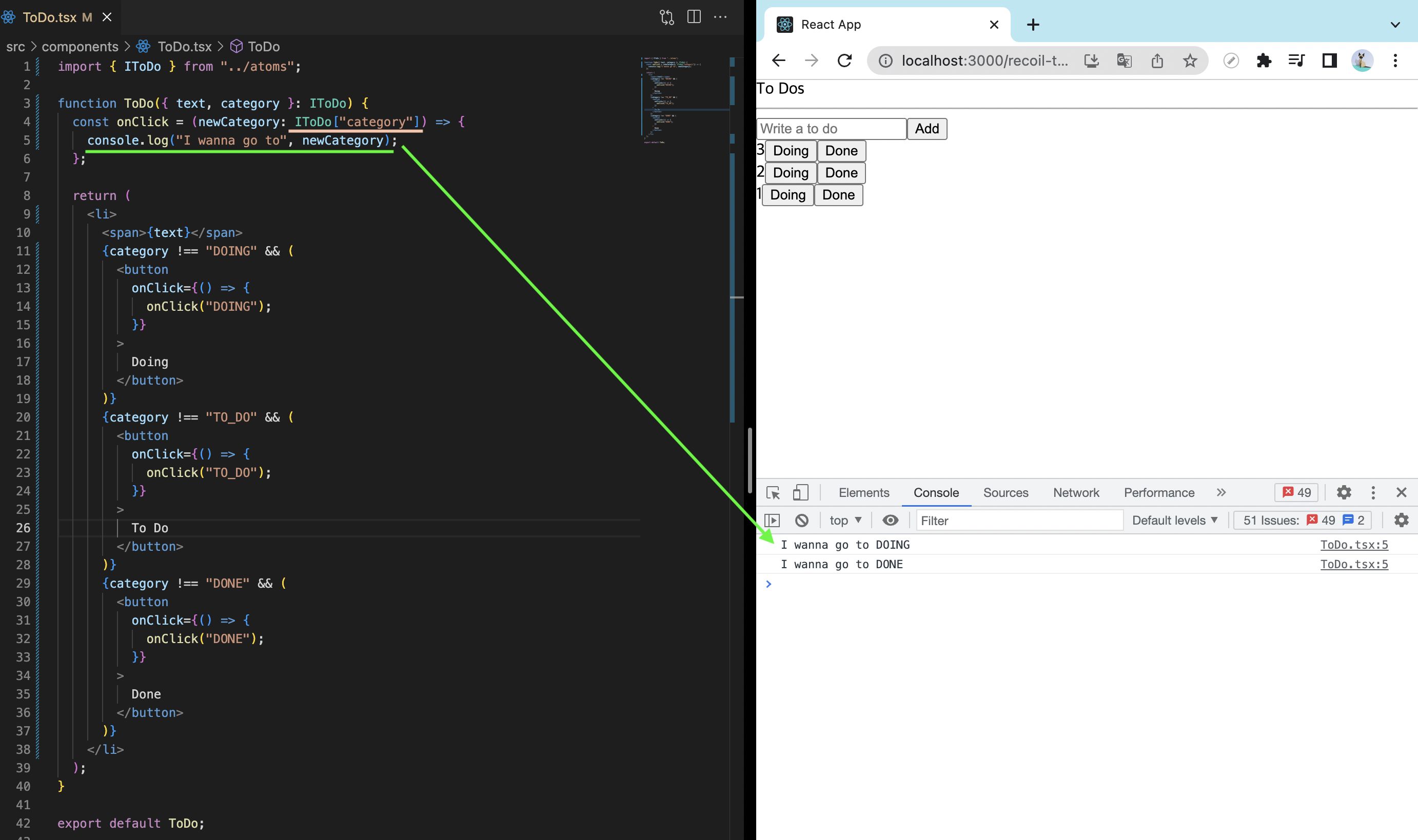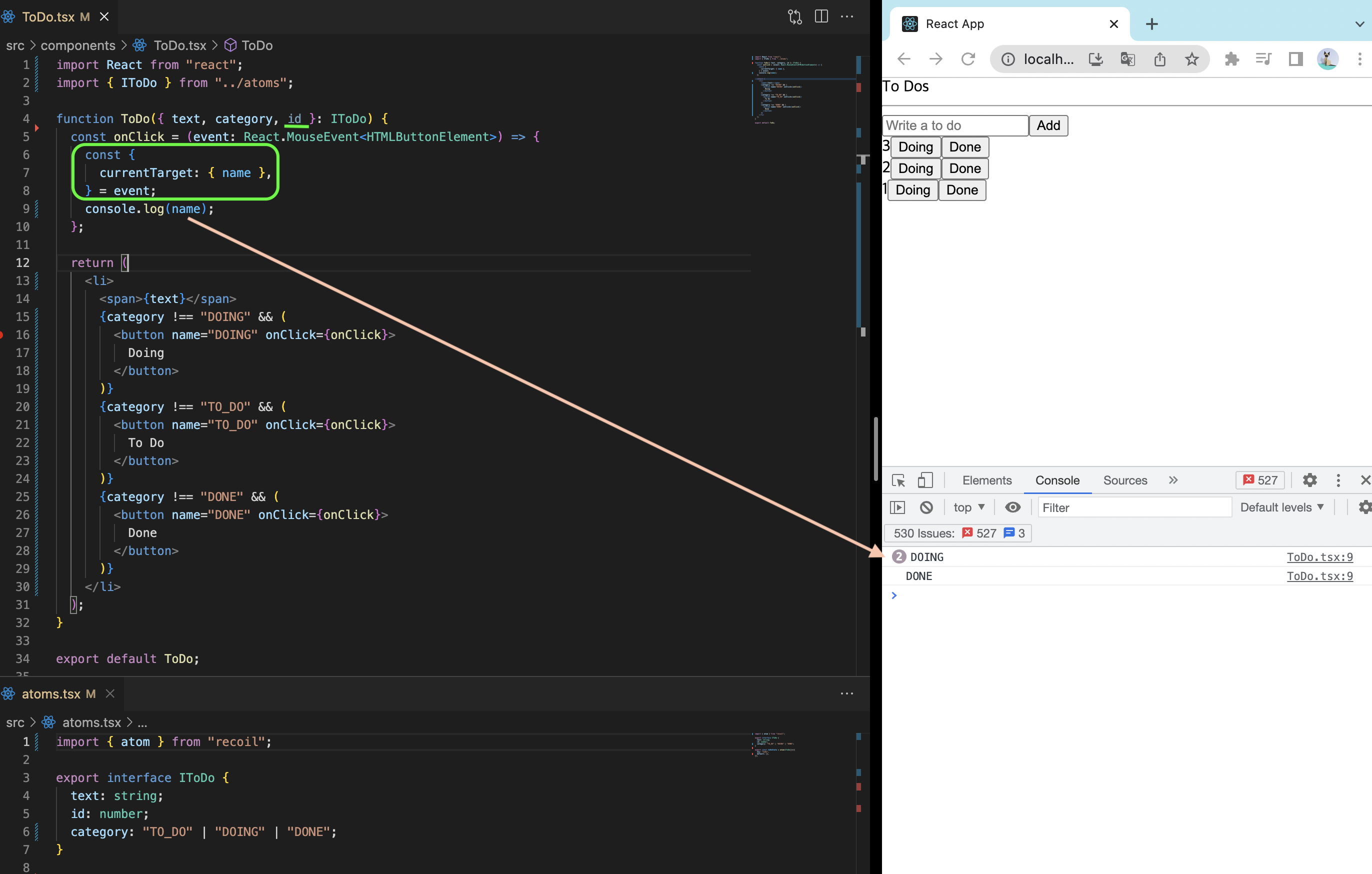 사용자가 Doing 버튼을 클릭하면, 인자를 통해서 Doing 버튼이 클릭됐다는걸 알아야 함! (그래야 toDo의 카테고리를 "DOING"으로 바꿀 수 있음)