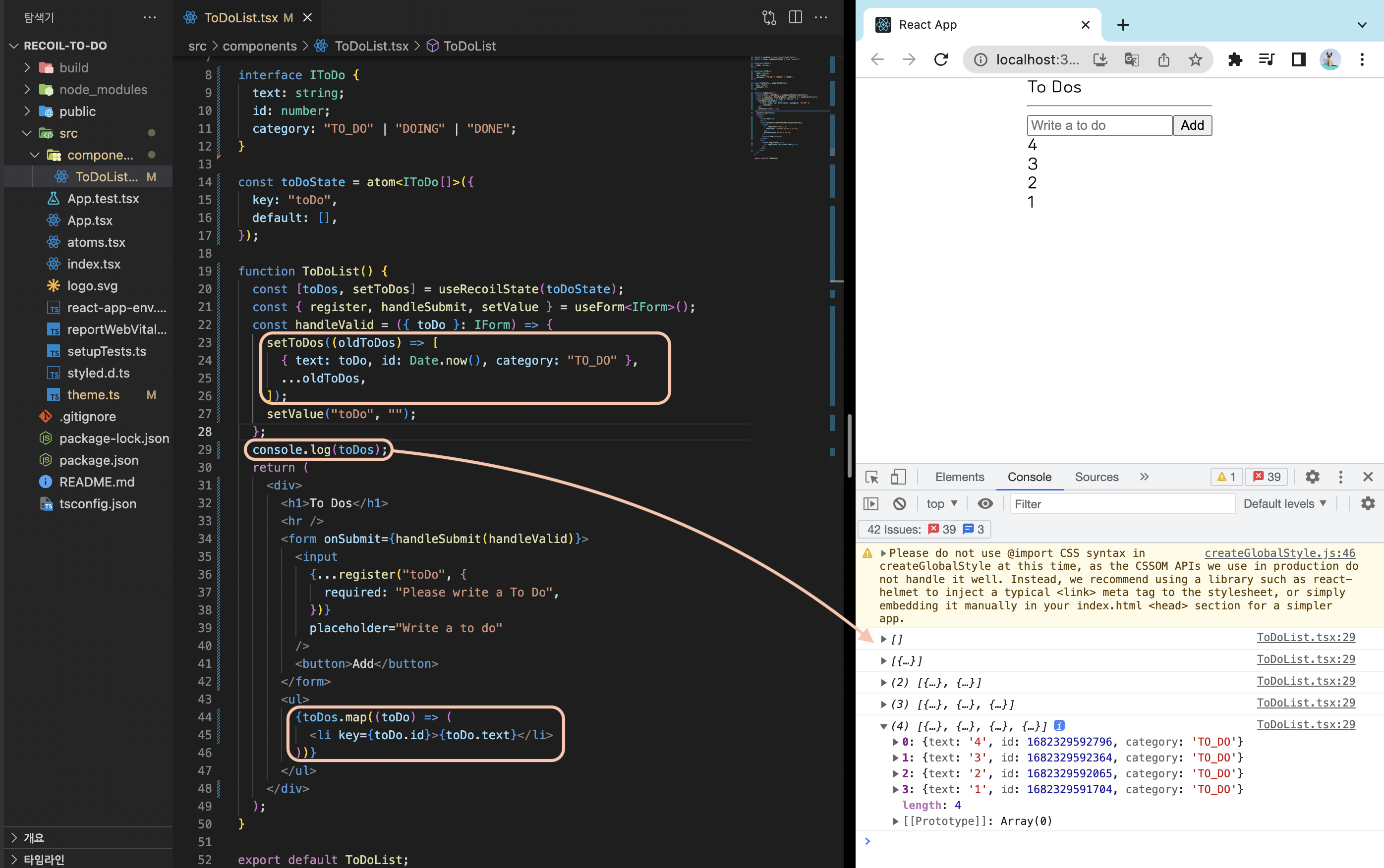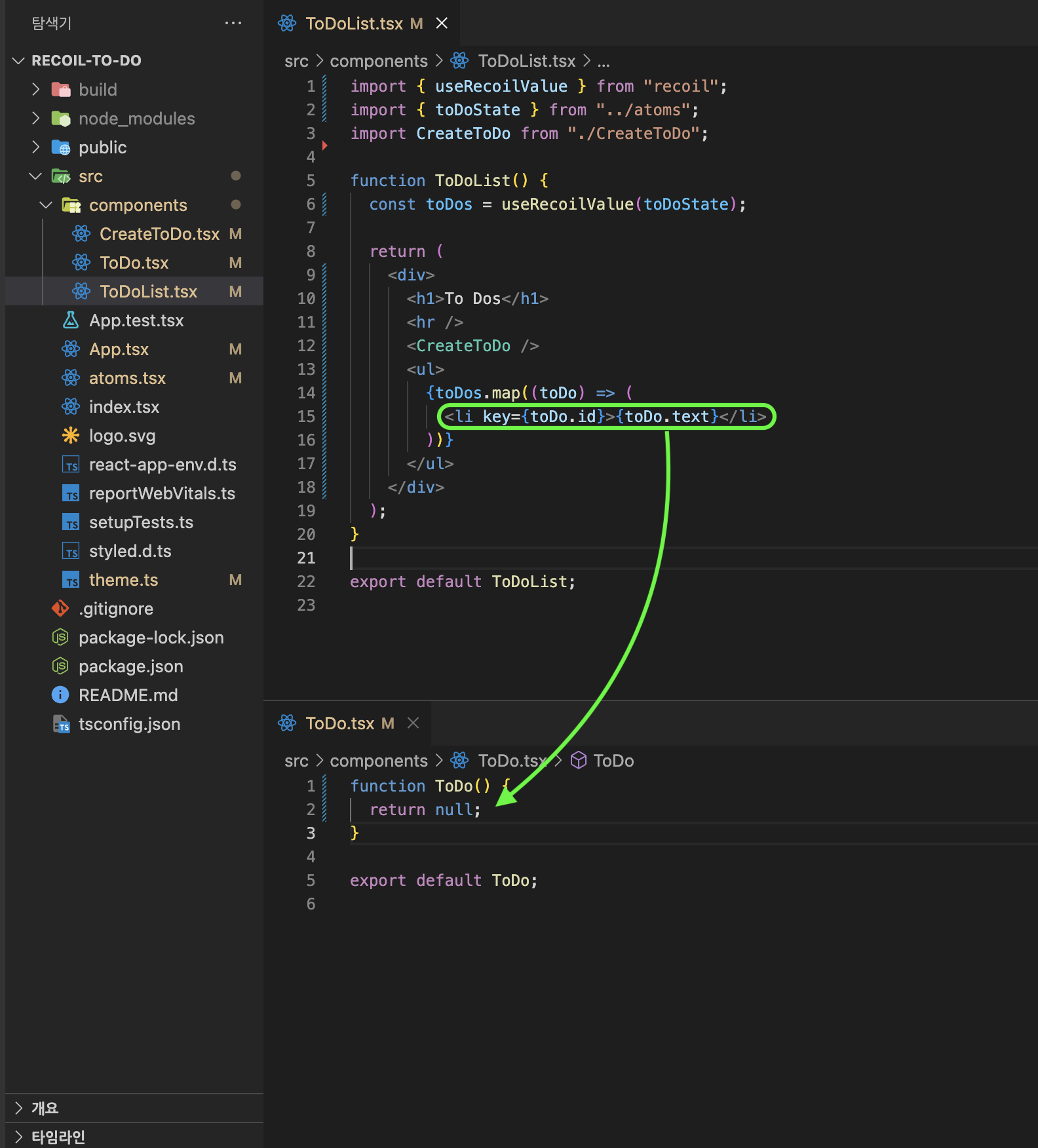 ToDoList.tsx는 map함수안에서 ToDo컴포넌트를 렌더링 되게 함
