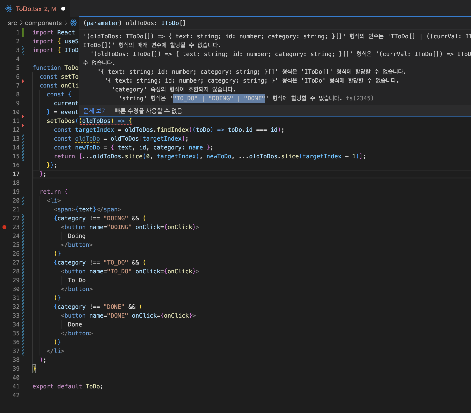 에러가 생기는 이유는 category는 그냥 string인데, toDo의 category는 세 종류로 제한되기 때문임.