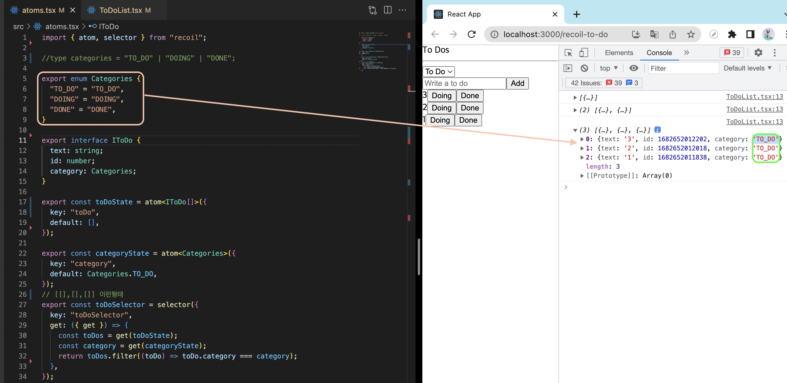 "TO_DO"또 쓰고 있는데 이런식으로 통일되지 않은건 좋은 방법이 아님. type은 복붙을 안 하게 해주는 단순한 문법일뿐."TO_DO" | "DOING" | "DONE";을 실수를 방지하기 위해 코드 전체에서 각각 한개씩 사용할 수 있게 고치는 것임.enum은 enumerable 이라는 뜻으로 이제 모든 category의 타입에는 이것을 쓸 거임.