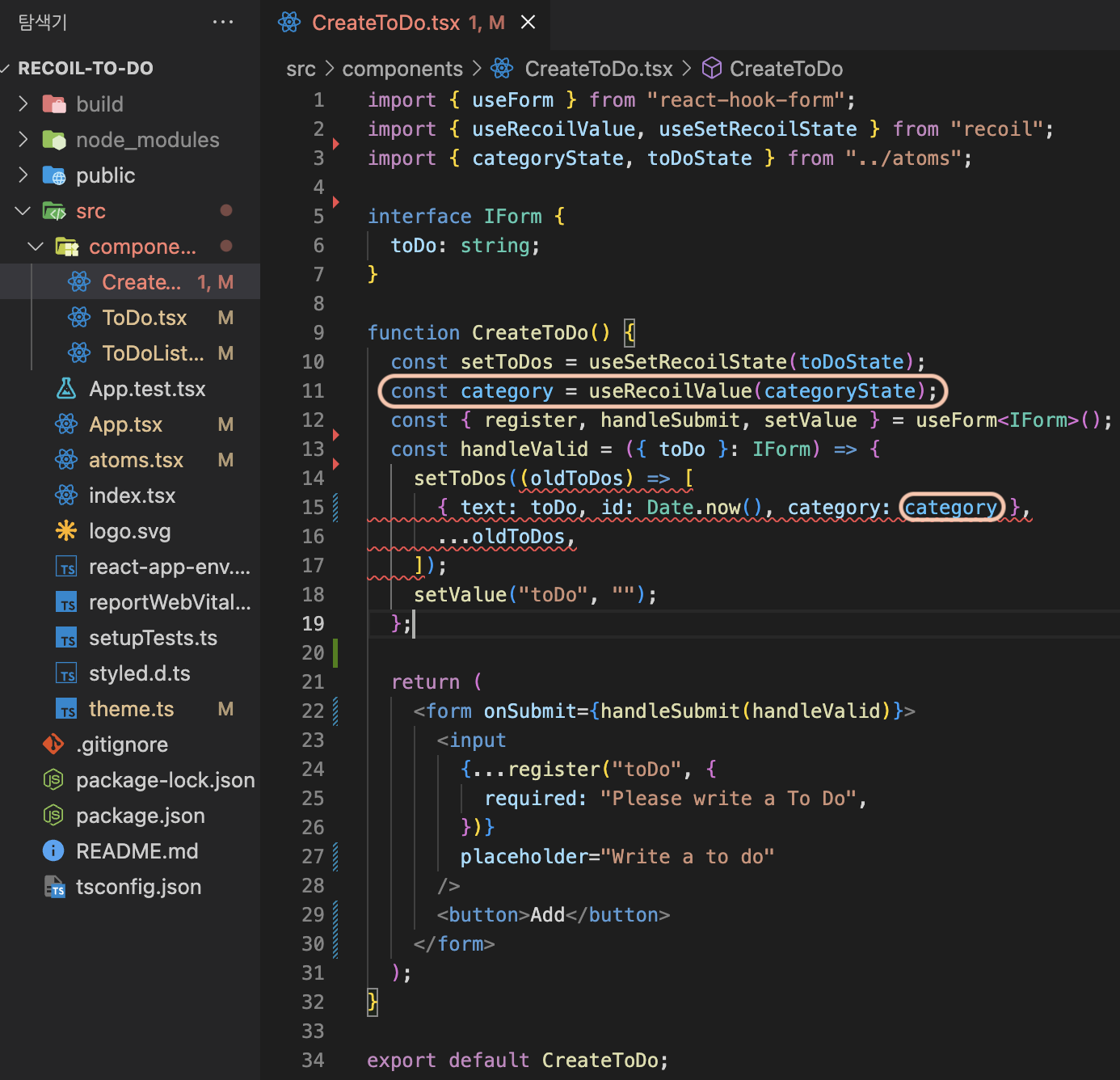 useRecoilValue()로 현재 카테고리를 얻어오고 setToDos 수정함수에 category: category로 변수를 넣어줌 category: category === category 동일함