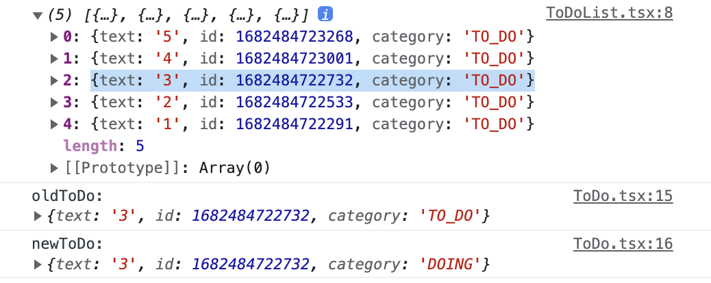 위와 같이 return 해주면 선택한 원소가 newToDo로 교체된걸 확인 할 수 있음.