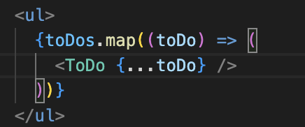 -> 이렇게 써도 작동하는 이유는, toDos 배열의 toDo원소 하나하나가 ToDo 컴포넌트에 필요한 props와 같은 모양이기 때문!