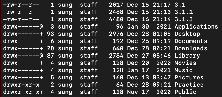 whoami: username sudo: temporarily use admin rights (root)sudo d로 시작: directory (폴더), - 로 시작: 파일 r: reading rights, w: writing rights, x: execution rights -drwxr-xr-x : sung has all rwx rights, staff has r & x, others have r& x cat : concatenatecat [options] [filenames] [-] [filenames]cat file1 file2 file3 : show content of all these files cat file(s) > file2 : combines files into (new) filecat file1 >> file2 : appends file1 to the bottom of file2cat > newfile : creates new file, then you can type in the content, close it by ctrl+Dcat file | more : displays content of the file one screen at a time cat - file5 > file6 : creates new file6 with text typed in from the keyboard followed by file5 content cat file7 - > file8 : creates new file8 with file7 content followed ty text typed in from the keyboard-b: 줄번호를 화면 왼쪽에 나타낸다. 비어있는 행은 제외한다.-e: 제어 문자를 ^ 형태로 출력하면서 각 행의 끝에 $를 추가한다. -n: 줄번호를 화면 왼쪽에 나타낸다. 비어있는 행도 포함한다. -s: 연속되는 2개이상의 빈 행을 한행으로 출력한다 -v: tab과 행 바꿈 문자를 제외한 제어 문자를 ^ 형태로 출력한다 -E: 행마다 끝에 $ 문자를 출력한다 -T: 탭(tab) 문자를 출력한다.-A: -vET 옵션을 사용한 것과 같은 효과를 본다.texteditor inside terminal!