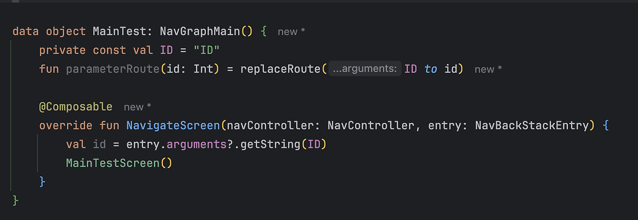 만약 파라미터를 필요로 하는 경우 위처럼 함수를 구현하고 navigate(NavGraphMain.MainTest.parameterRoute(2)) 로 사용하면 된다 !