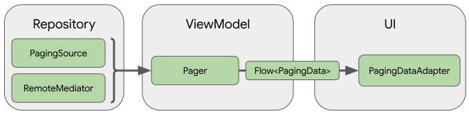 이러한 Paging3 는 Repository 에서 PagingSource 혹은 내부 DB를 사용하는 경우 RemoteMediator 를 통해 Pager<Key, Value> 로 변환되며 이를 다시 내부 메소드로 구현되어 있는 flow 함수를 통해 Mapping 과정을 거쳐 Flow<PagingData> 형으로 변한다.
