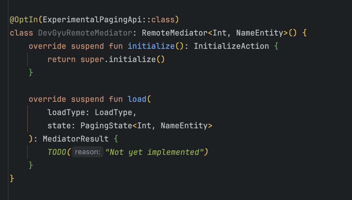 우선 RemoteMediator 를 추가해주기 위해 위처럼 RemoteMediator<Key, Value> 를 상속받는 커스텀 클래스를 구현해주자 !