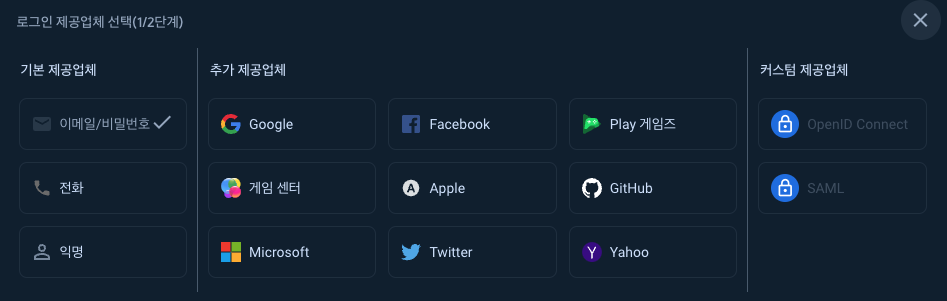 인증(로그인) 수단을 선택해야 하는데, 소셜로그인을 구현하고 싶다면 우측에서 골라주면 된다.