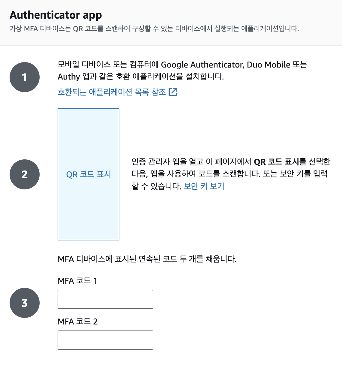 Authy에서 'Add Account'를 클릭하여 아래에서 나타나는 QR코드를 찍거나 (모바일인 경우) '보안 키 보기'를 클릭하여 나타나는 보안키를 입력하여 토큰을 추가한뒤 MFA 코드 두 번을 입력하면 MFA 추가가 끝난다.