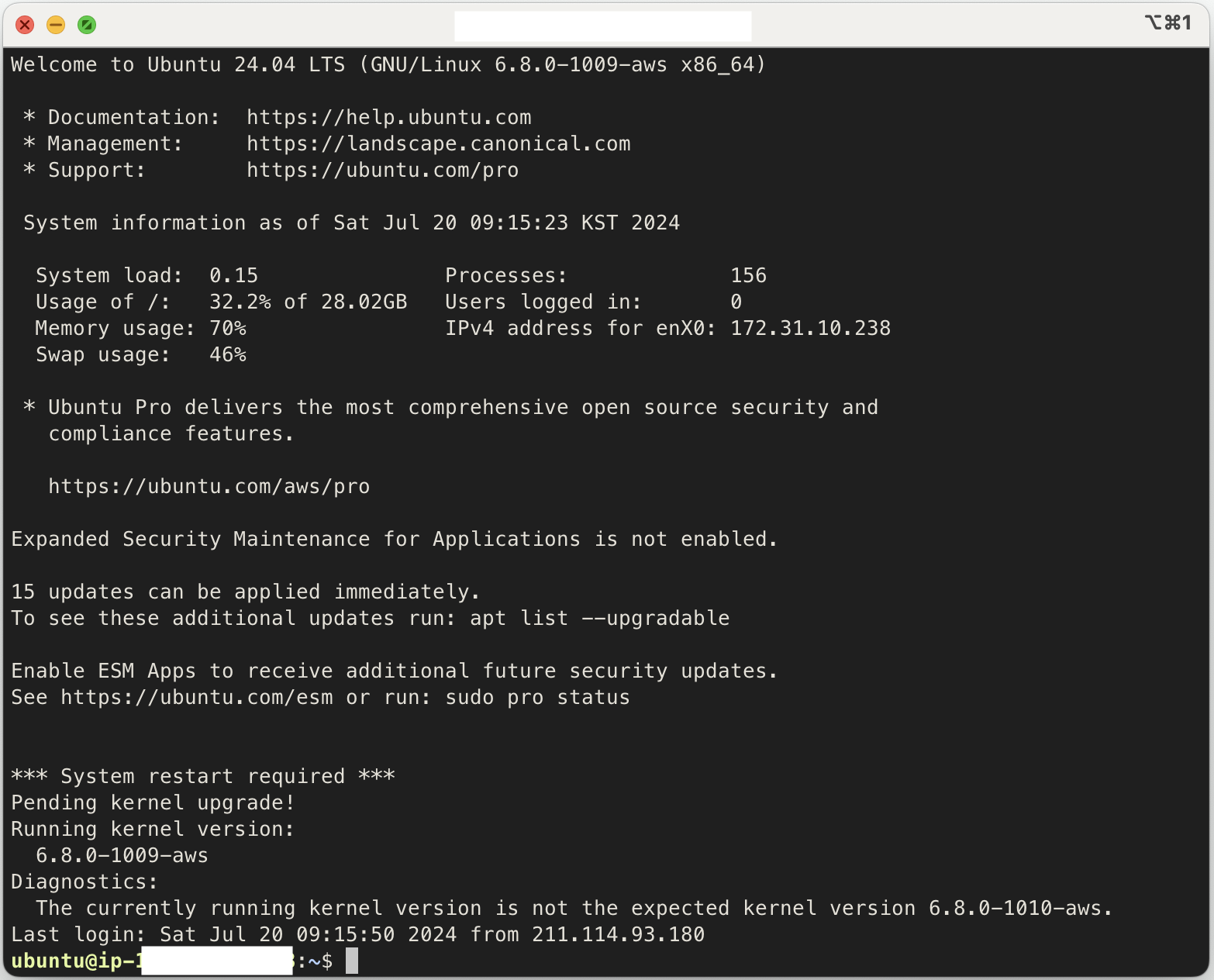 $ ssh -i {키 경로}/{키 이름}.pem {서버 호스트명}@{탄력적 IP}