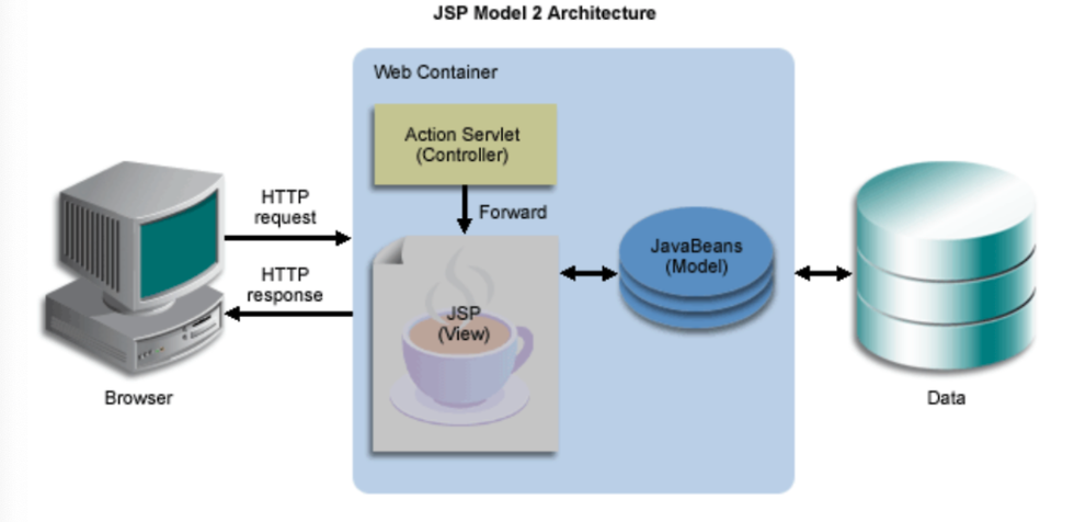 Model 2는 모든 요청을 서블릿이 받아 처리하고 JSP 페이지로 포워드한다.