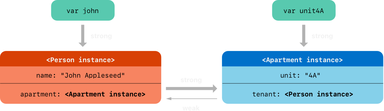 john과 unit4A의 값이 nil이되었지만 Person instance와 Apartment instance는 서로를 참조하고 있기 때문에 메모리에서 제거되지 않았다. 이렇게 되면 각각의 인스턴스에 접근할 수도 없고 제거할 수도 없는 메모리 누수가 발생한다. 이를 해결하는 방법은 weak이나 unowned reference를 이용하는 것이다.