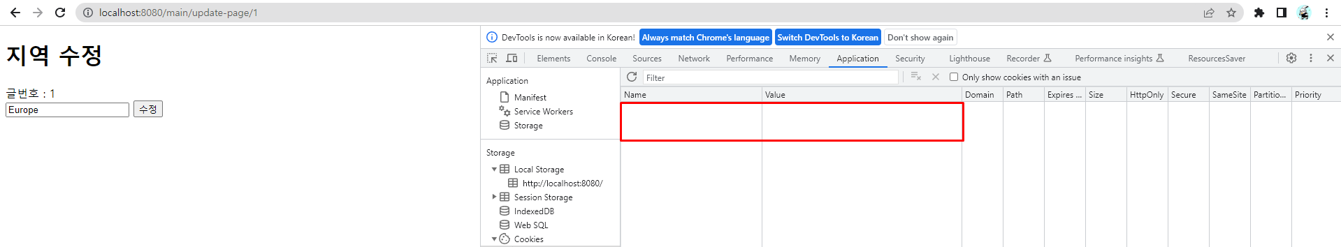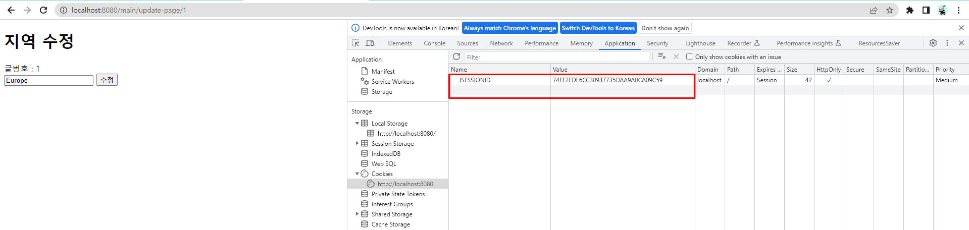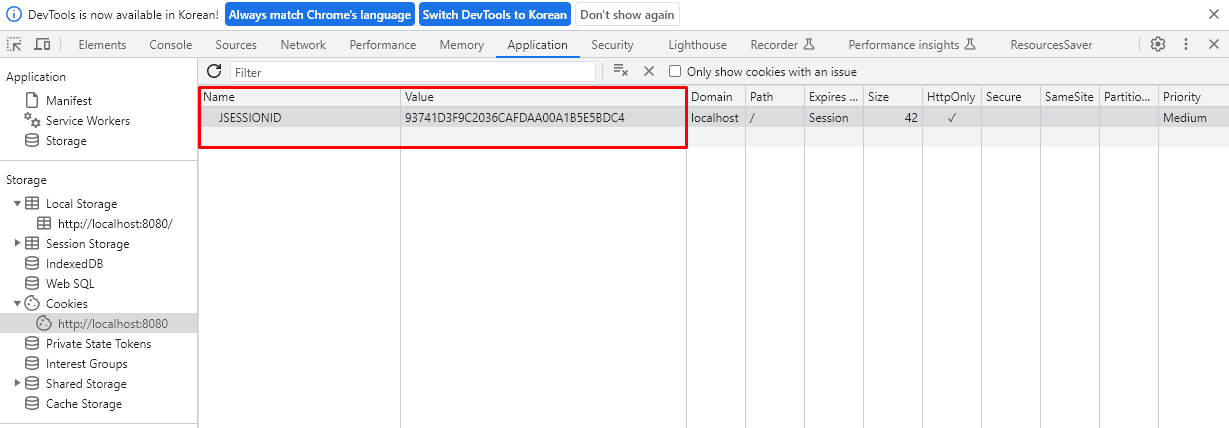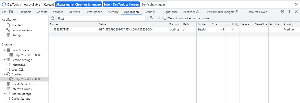 적고 실행해서 f12눌려서 cookie를 보면 jsession이 발급되어있는 걸 볼 수 있다.
