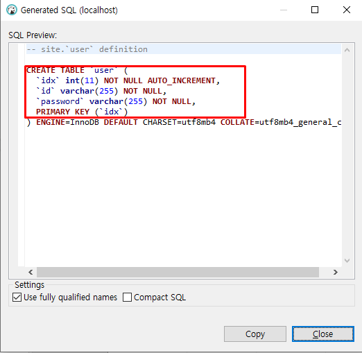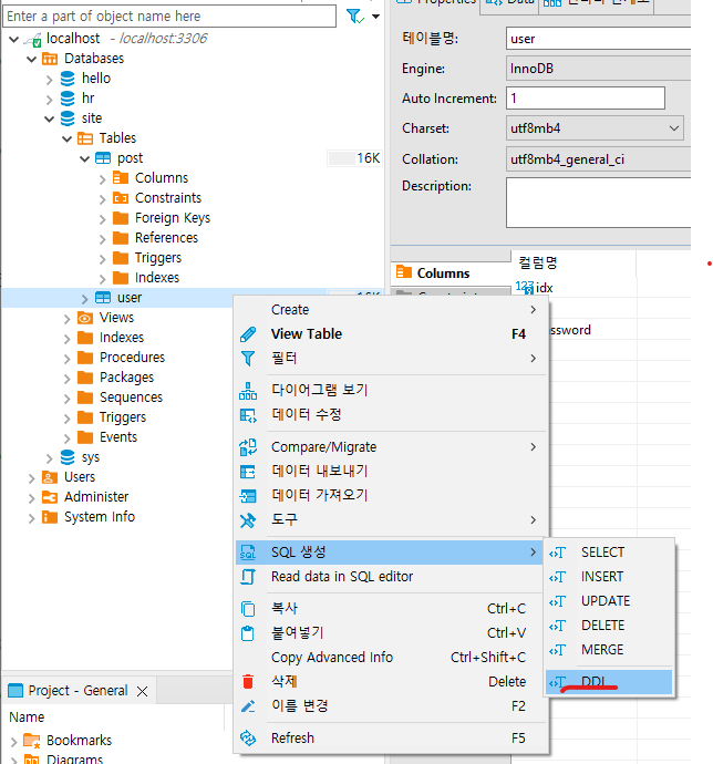 컬럼은 다 작성한 테이블에서 DDL을 클릭해 열서어 만들어진 쿼리문을 복사해온다.