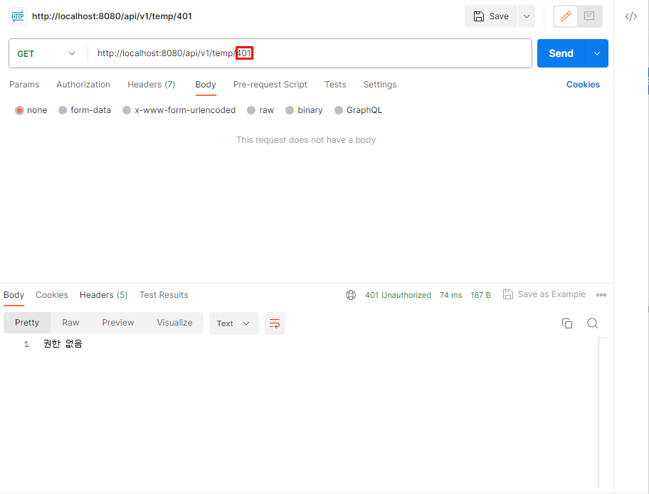 return new ResponseEntity<>("권한 없음", HttpStatus.UNAUTHORIZED); // body는 생략가능
