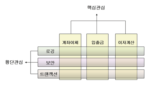 예를 들어 핵심적인 관점은 비즈니스 로직이 될 수 있고, 부가적인 관점은 핵심 로직을 실행하기 위해 행해지는 데이터베이스 연결, 로깅, 파일 입출력 등이 될 수 있다.