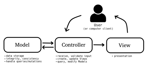 사용자가 controller를 조작하면 controller는 model을 통해서 데이터를 가져오고 그 정보를 바탕으로 시각적인 표현을 담당하는 View를 제어해서 사용자에게 전달하게 된다.