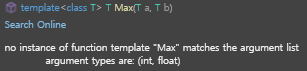 < >를 사용하여 명확한 template type을 제시하지 않았기 때문에 컴파일러는 int, float type으로 되어 있는 함수 템플릿을 찾는다, 하지만 존재하지 않기 때문에 에러가 발생하는 것이다