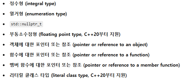 non-type 매개변수는 아래와 같은 타입이 될 수 있다