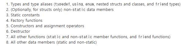 다음은 Google C++ Style Guide 문서에서 나열한 클래스 멤버 데이터 선언 순서이다