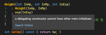 Knight(int, int, int)는 Knight(int, int)생성자를 위임 받았는데 exp를 자체적으로 초기화하려고 해서 컴파일 에러가 발생함