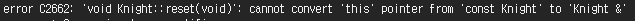 non-const 멤버함수의 this는 Knight* const이다, 하지만 넘겨받은 암시적 객체는 const Knight이기 때문에 에러가 발생하는 것이다