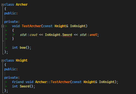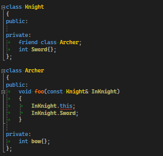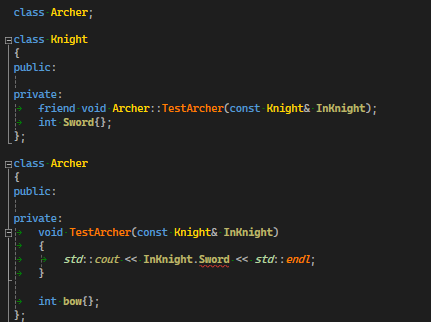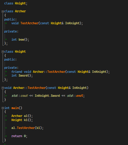 std::cout << InKnight.Sword << std::endl; //Knight클래스에서 Archer::TestArcher가 friend멤버 함수로 지정되었기 때문에 Sword에 접근이 가능하다