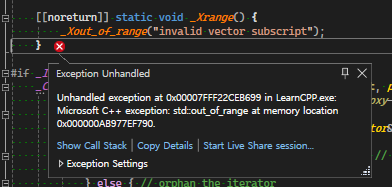 a.at(10)은 a배열에서 유효하지 않은 index이기 때문에 프로그램을 종료시키고 std::out_of_range 예외를 던진다