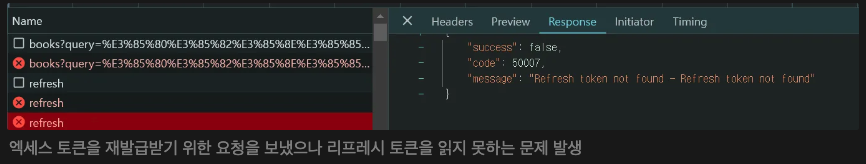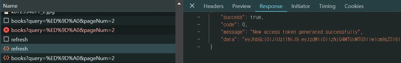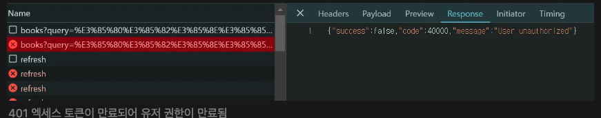 알고보니 재귀적으로 발생하던 401 에러는 백엔드에서 리프레시 토큰 값을 일부만 저장해 같은 토큰임에도 데이터베이스에서 찾아볼 수 없어 생기는 오류여서 금방 해결할 수 있었다.
