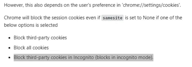 일반 브라우저와 시크릿 모드에서의 에러 차이로 인해 시크릿 모드의 문제일까 싶어서 구글링을 해보나 스택오버플로우에서도 시크릿모드에선 강제로 서드파티 쿠키 막는다고 한다.