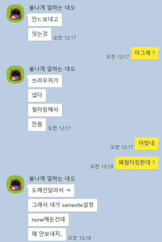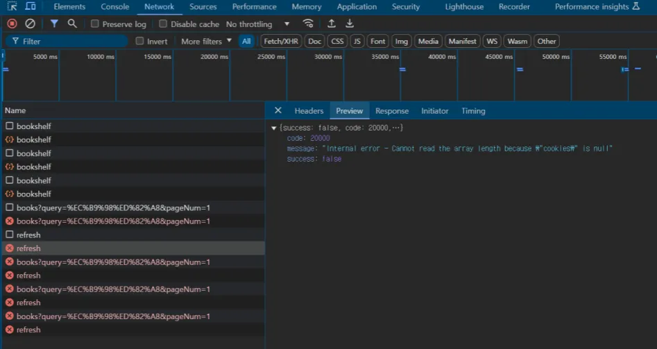 그렇기 때문에 백엔드에서는 쿠키가 없다고 판단해 401 권한 없음 에러와 500 쿠키없음 에러를 번갈아 가며 호출하고 있던 것이었다.