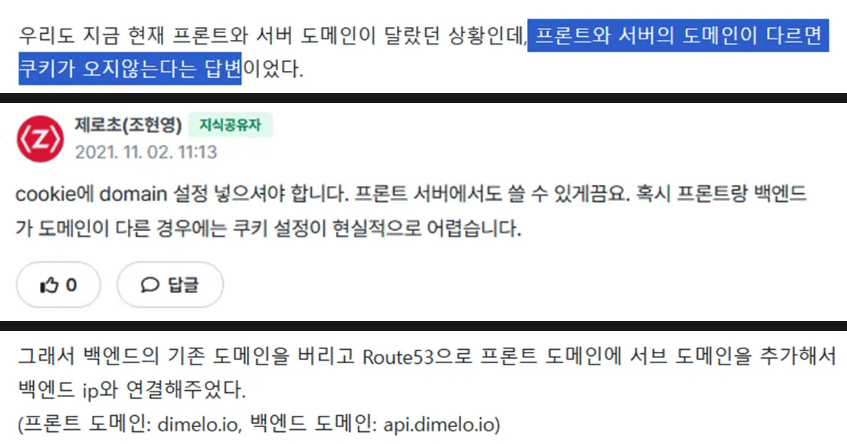 두 도메인의 서브 도메인이 다르기 때문에 쿠키 설정이 어렵다는 이야기였다.