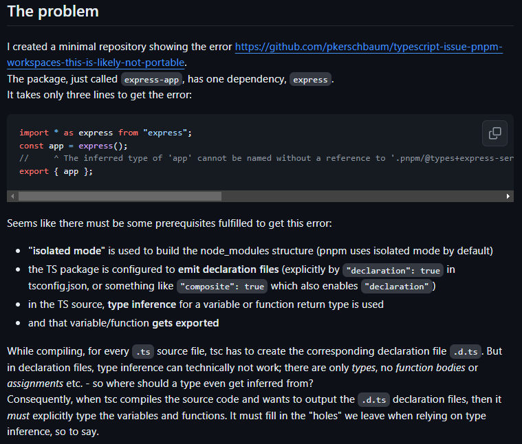 즉 TS컴파일러가 내가 작성한 위의 코드를 .d.ts로 변환하는 과정에서 react-router가 의존하는 '@remix-run/router'에서 지정된 router타입을 명시해줘야 한다. 하지만 내 프로젝트는 react-router에 대한 의존성만 가지고 있다. pnpm을 사용하면 간접 의존성인 '@remix-run/router'에서 타입정보를 직접 참조할 수 없기 때문에 타입추론이 안됐던 것이다.