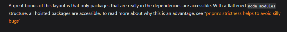 즉 위 사진속의 패키지들의 중앙저장소인 .pnpm-store에 설치되어 있고 .pnpm폴더에서는 하드링크를 걸어 같은 파일을 참조할 수 있도록 해주는 것이다. 그리고 내가 설치했던 패키지들에 심볼릭 링크를 걸어 간접 의존성으로 가져온다. 그래서 내 프로젝트에서는 내가 직접 설치한 패키지에만 엑세스 할 수 있다는 것이다. 이전의 시도가 실패했던 이유는 이 때문이었다.