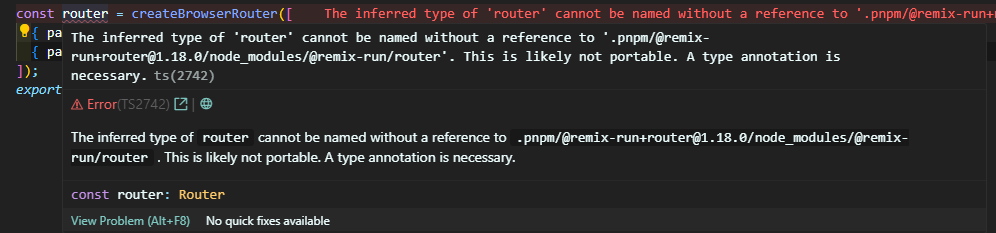 The inferred type of ‘router’ cannot be named without a reference to ‘.pnpm/@remix-run+router@1.18.0/node_modules/@remix-run/router’ . This is likely not portable. A type annotation is necessary.